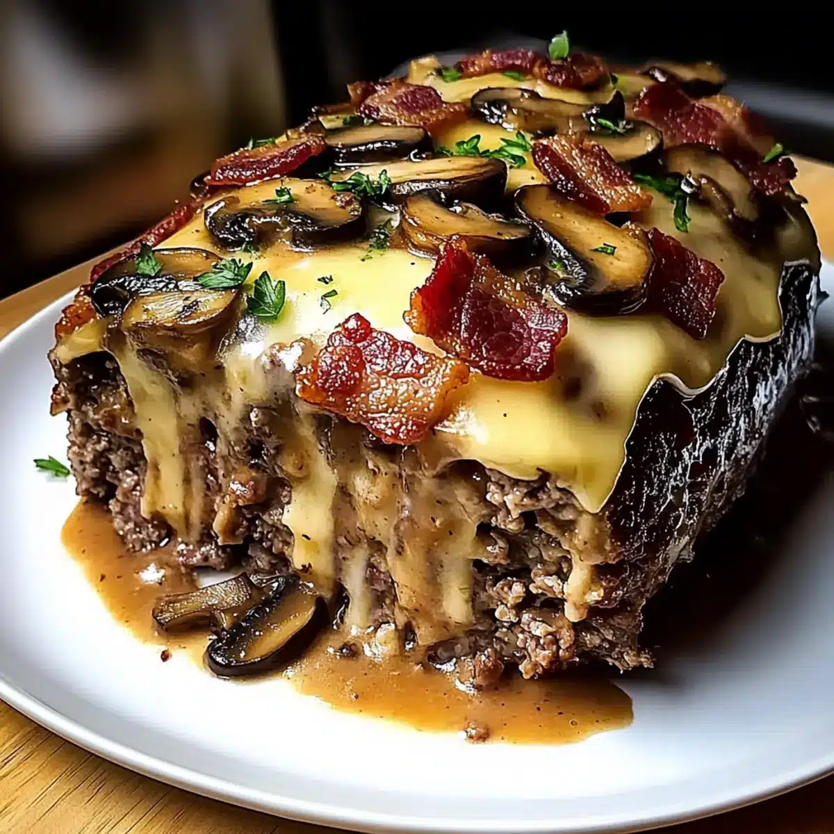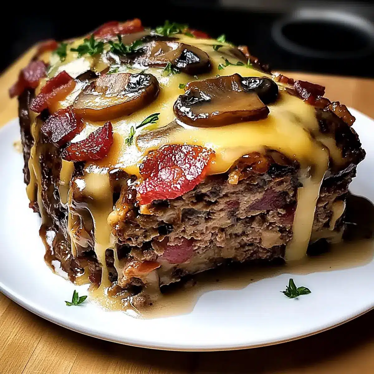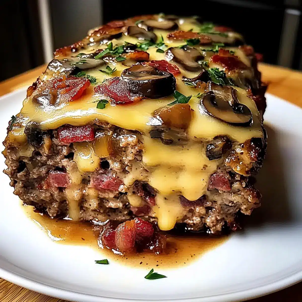 Once rested, carefully slice the meatloaf and drizzle with any pan juices for added flavor. You may choose to garnish with freshly chopped parsley for a pop of green. Serve your delicious Bacon Mushroom Meatloaf with your favorite sides for a hearty meal that’s sure to become a family favorite.