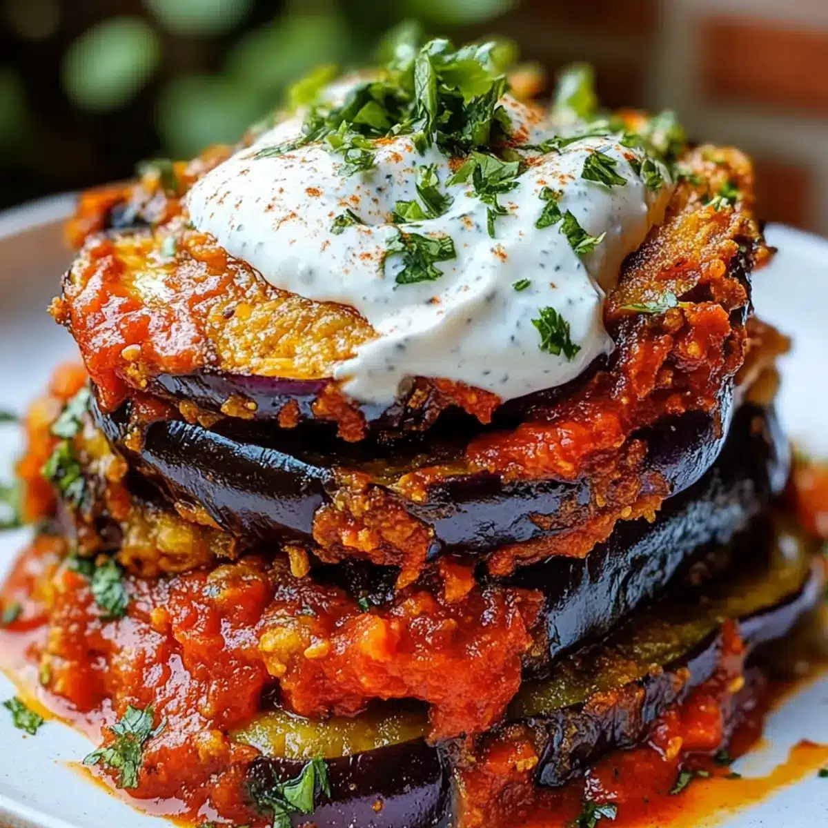 - Layer fried eggplant, pour tomato sauce over, and dollop herbed yogurt on top.