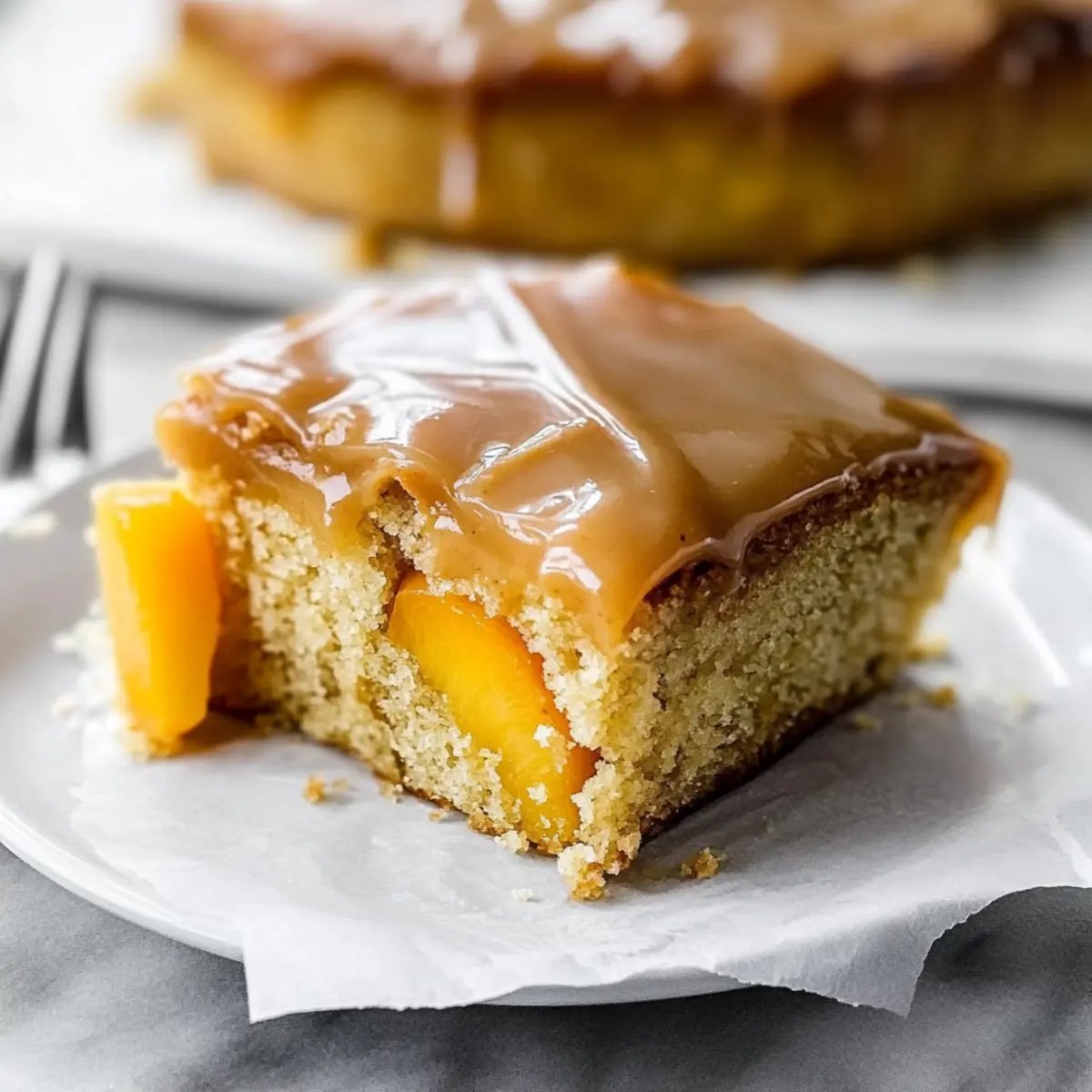 Once your Brown Sugar Peach Cake is baked and slightly cooled but still warm, pour the brown sugar frosting evenly over the top. Use a spatula to spread it out gently, allowing it to absorb into the cake slightly for a moist finish. Let the cake set for a few moments before slicing, as this will help the frosting adhere better.
