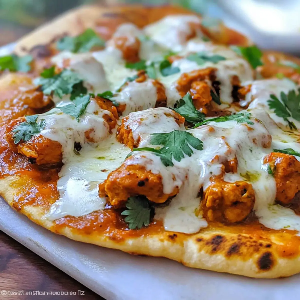 Once baked, remove the pizzas from the oven and let them cool for a minute. Garnish with fresh cilantro and a drizzle of plain natural yogurt for a cooling contrast. Slice the Butter Chicken Pizza into wedges, and serve hot for an irresistible meal that everyone will love!