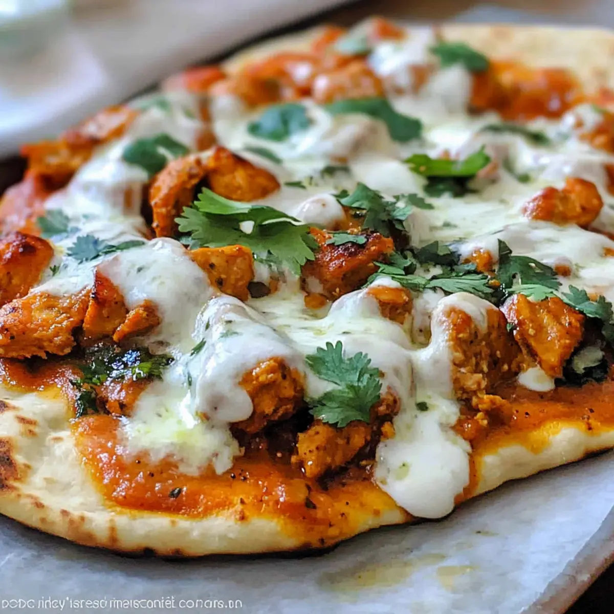 For this Butter Chicken Pizza Recipe, I recommend using frozen naan bread, which can be found in the freezer section of your local grocery store. Look for styles that are soft and thick to ensure they hold the toppings well. Feel free to experiment with other types, like garlic naan, to add a unique twist.