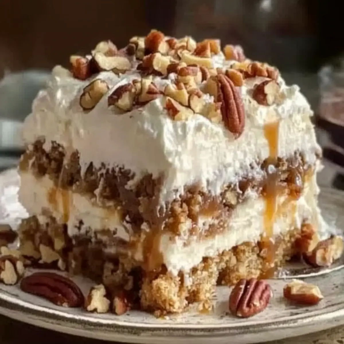 Once cooled, spread a generous layer of whipped topping evenly across the surface of the cake. Feel free to use homemade whipped cream for an added touch of goodness. This creamy layer balances the cake’s richness and adds an inviting aesthetic to your Butter Pecan Praline Poke Cake.