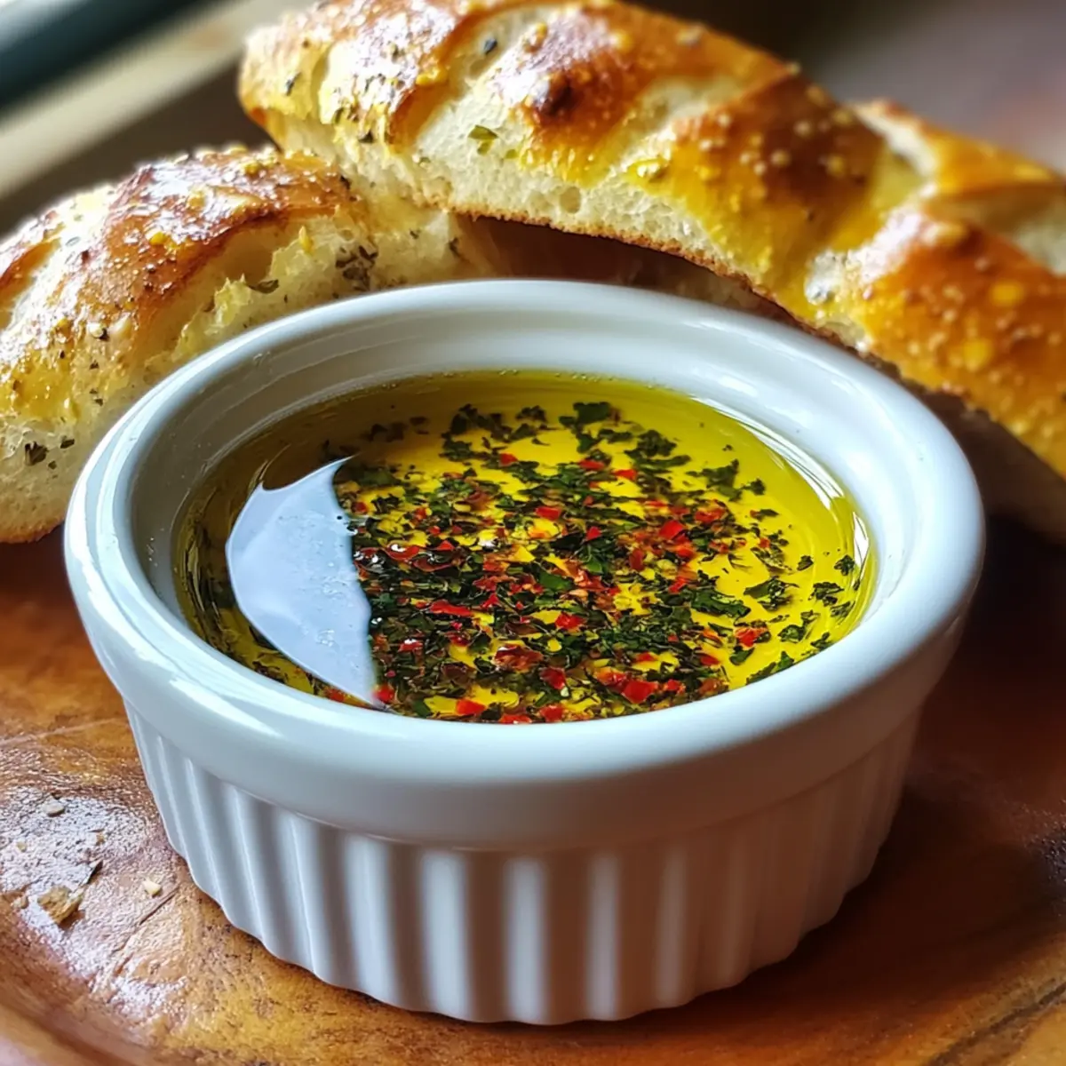 After the infusion time, transfer the flavorful oil to a shallow serving dish or ramekin. Use a spoon to drizzle a bit of oil over the surface to highlight the herbs floating on top. Present the dipping oil next to warm crusty bread or rolls, creating an inviting centerpiece for your guests to enjoy with this delightful Italian appetizer.