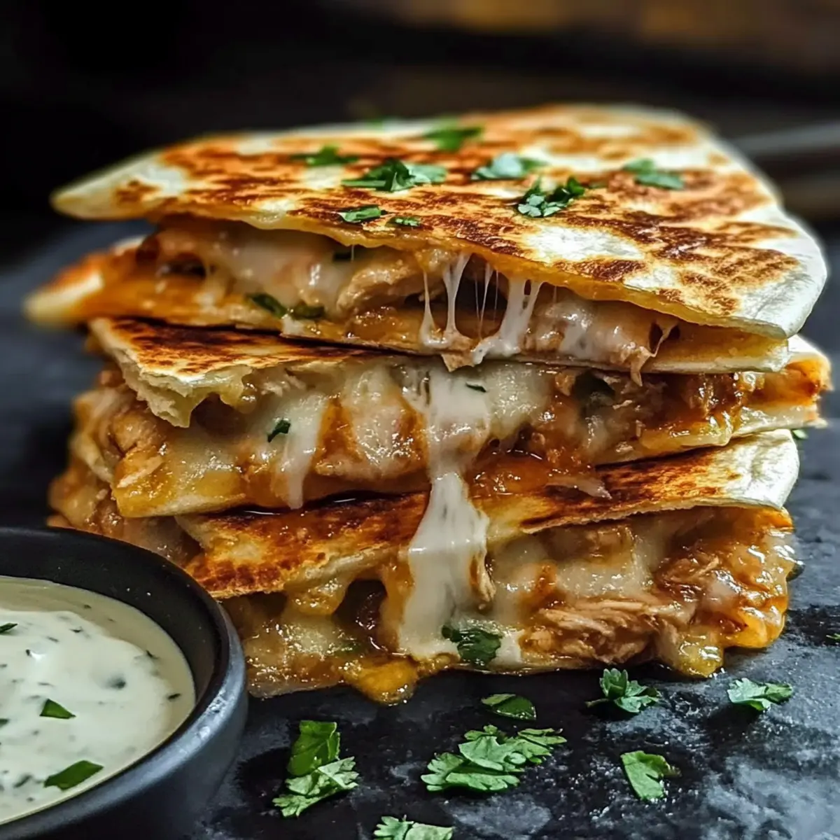 Once all quesadillas are grilled, remove them from the skillet and let them sit for a minute before slicing into wedges. Arrange the cheese-filled quesadillas on a serving platter and drizzle with the chilled jalapeño cream sauce on the side. Garnish with fresh cilantro for a vibrant finish, and get ready to delight everyone with your Cheesy Hot Honey Chicken Quesadillas!