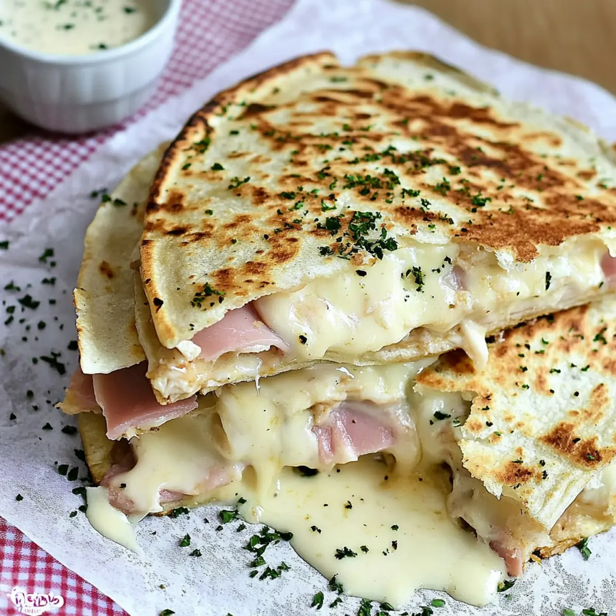 In a large skillet, heat 1 tablespoon of melted butter over medium heat. Place a flour tortilla in the skillet, allowing it to sizzle slightly. On half of the tortilla, layer ½ cup of Swiss or provolone cheese, followed by 2 ounces of deli ham, ½ cup of shredded grilled chicken, and a drizzle of the creamy sauce. Sprinkle with ¼ cup of toasted breadcrumbs before adding another layer of cheese, and finally, fold the tortilla in half.