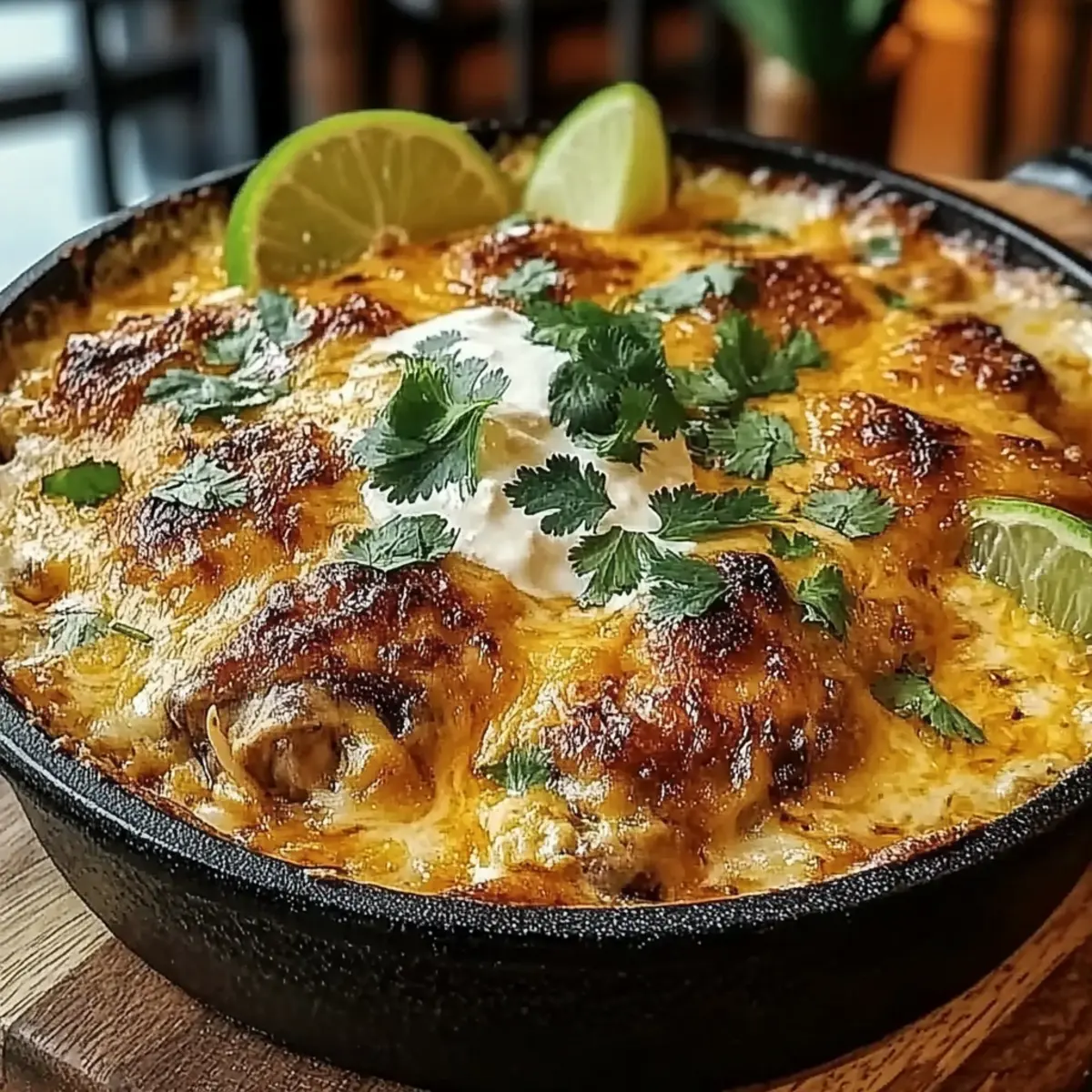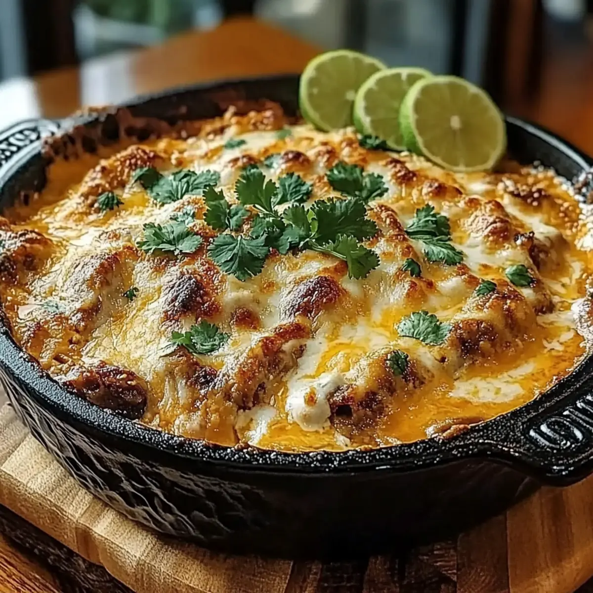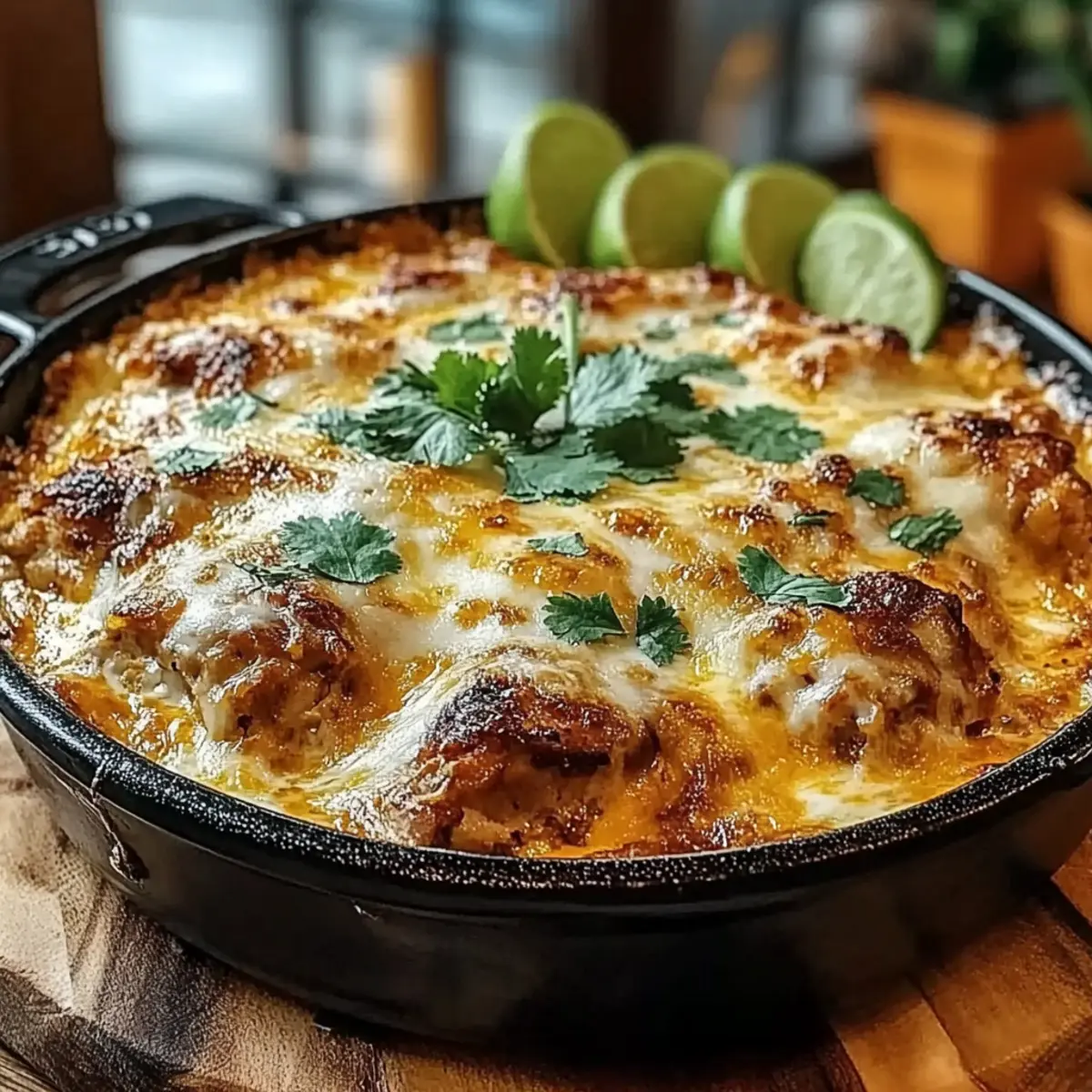Once baked, carefully remove the skillet from the oven and let it rest for about 5 minutes. This resting period allows the flavors to settle. Before serving, garnish with freshly chopped cilantro and a squeeze of lime juice to enhance the dish’s brightness, bringing your delicious Chili Chicken Queso Bake to life!