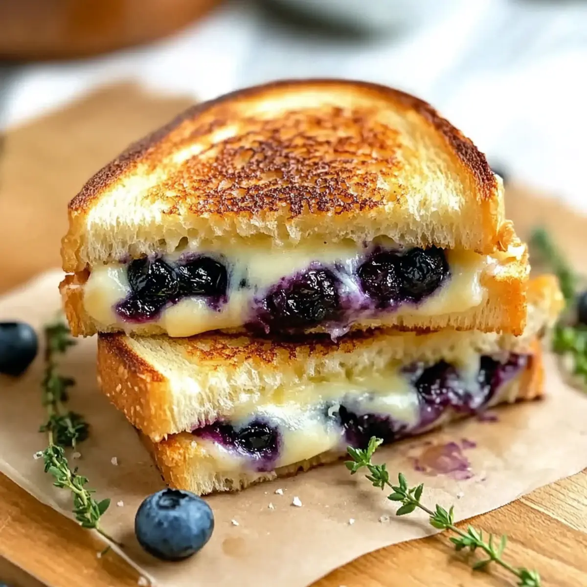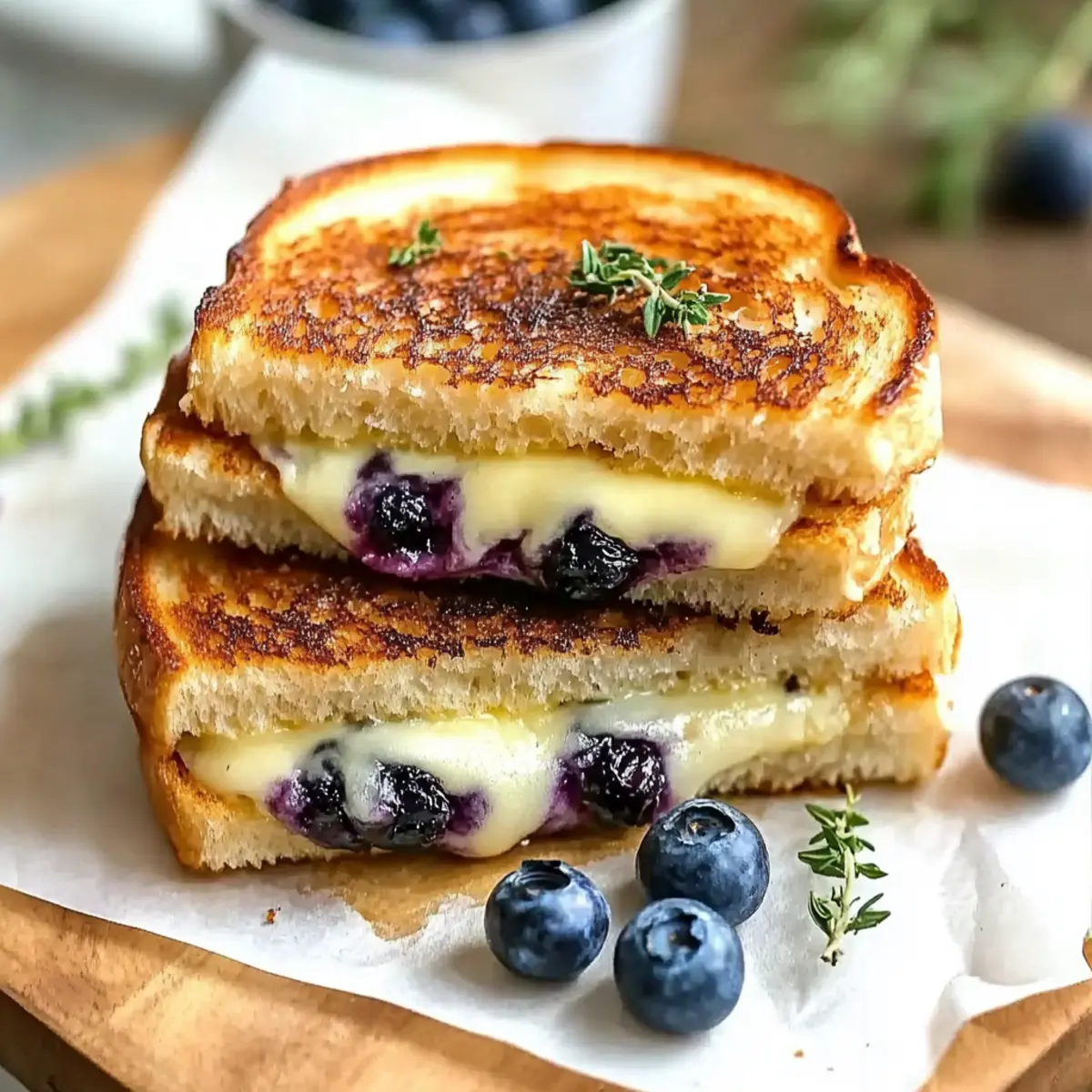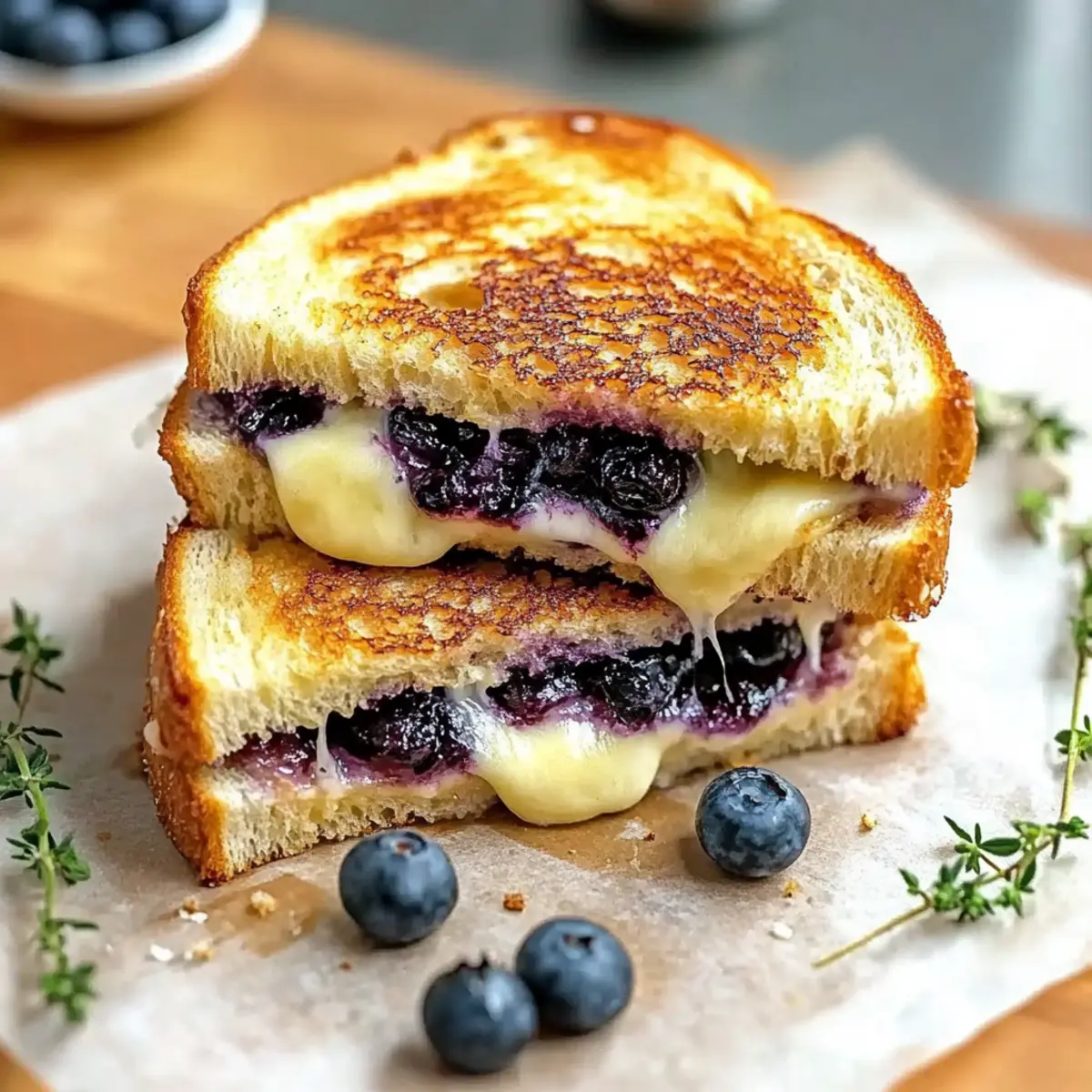 Once both sides are golden brown and the cheese has melted, remove the sandwiches from the skillet. For an extra touch, sprinkle a little flaky sea salt and fresh thyme on top before slicing them in half. Serve immediately while they’re warm, with the sweet-tart blueberry flavor and gooey cheese ready to delight your palate.
