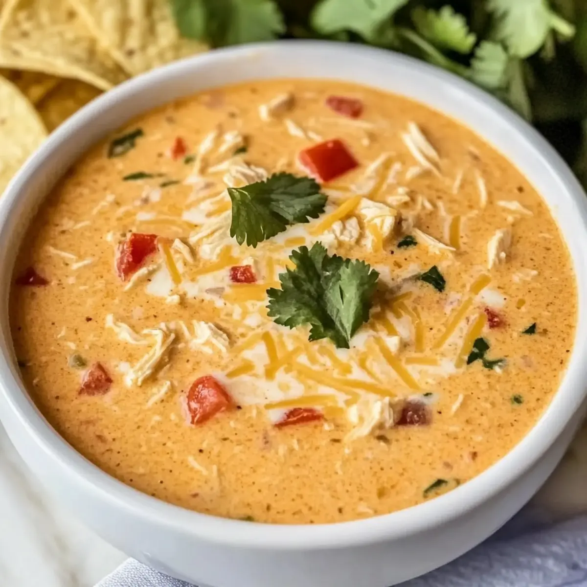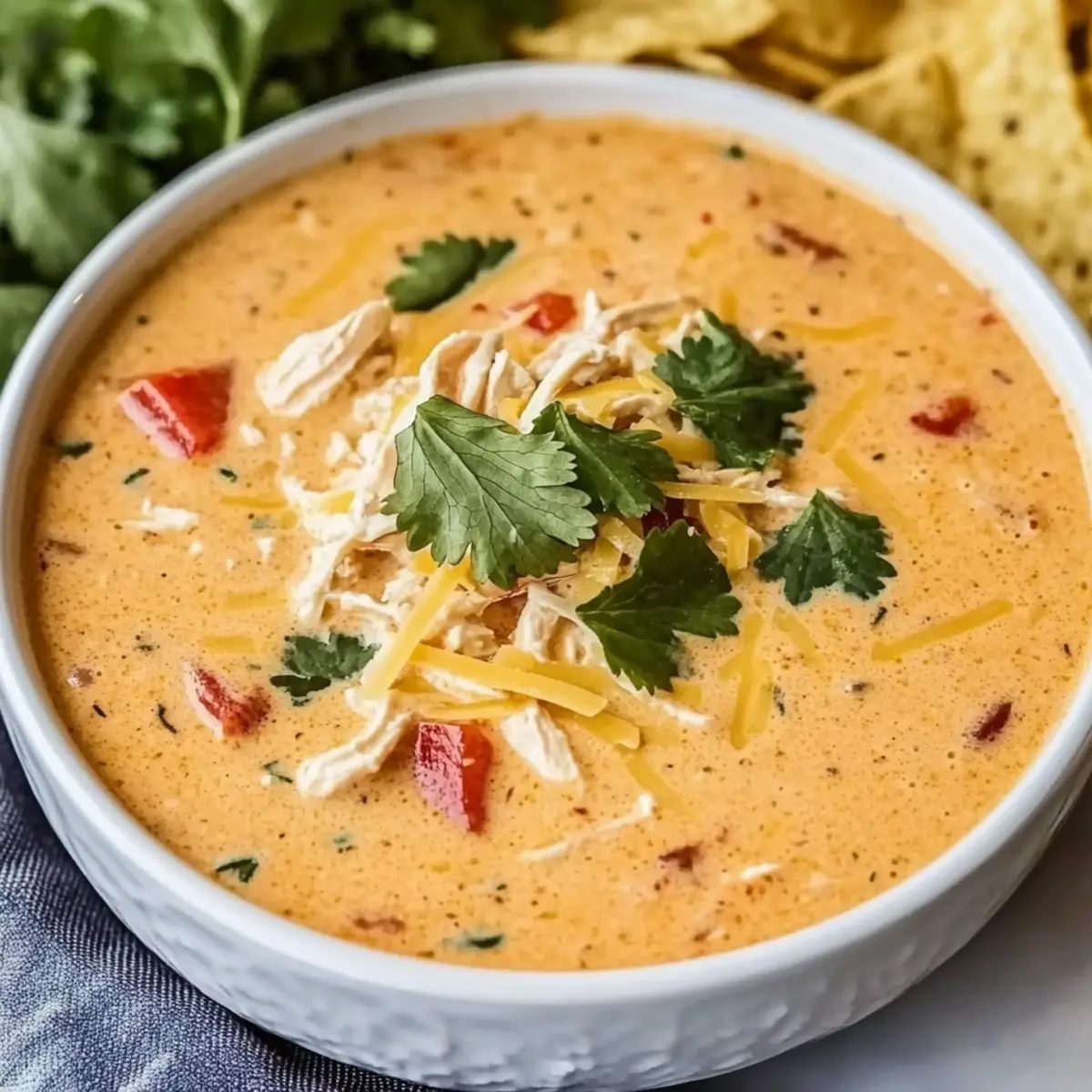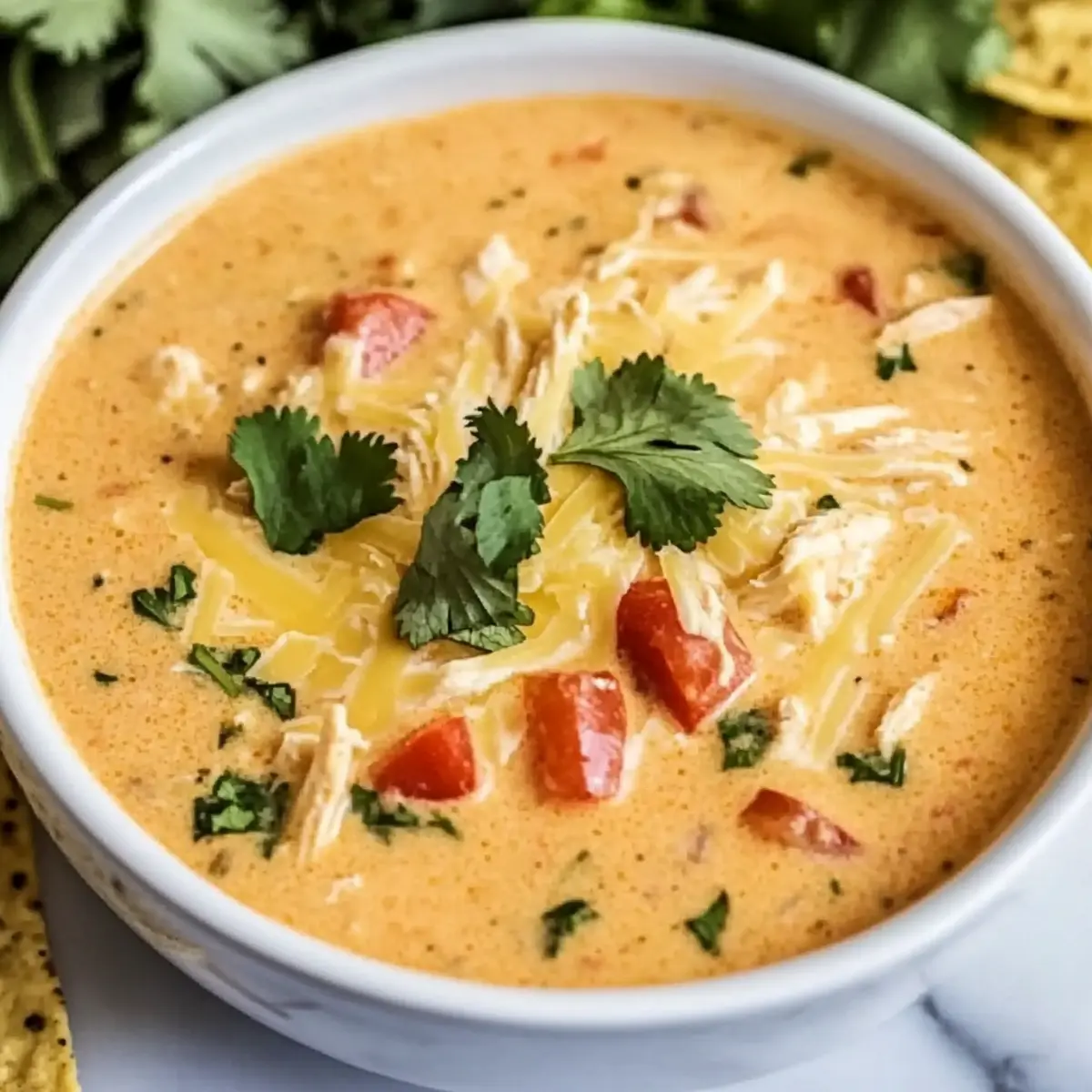 When cooking time is complete, remove the lid and stir the soup to combine all the ingredients thoroughly, ensuring the melted cream cheese is well integrated. Serve the soup hot, garnishing each bowl with a sprinkle of shredded Mexican cheese, chopped cilantro, and a handful of tortilla chips on the side for a delightful crunch.