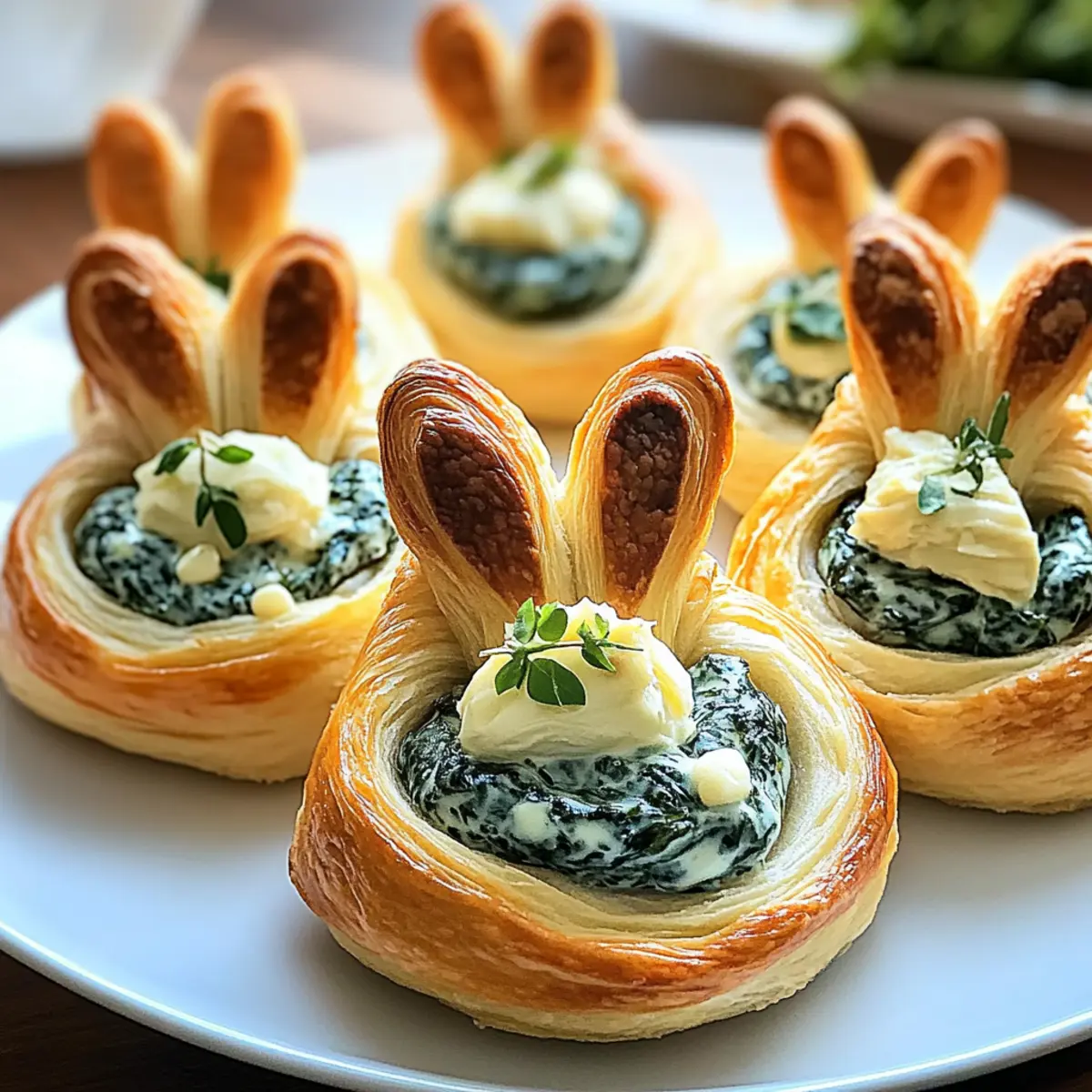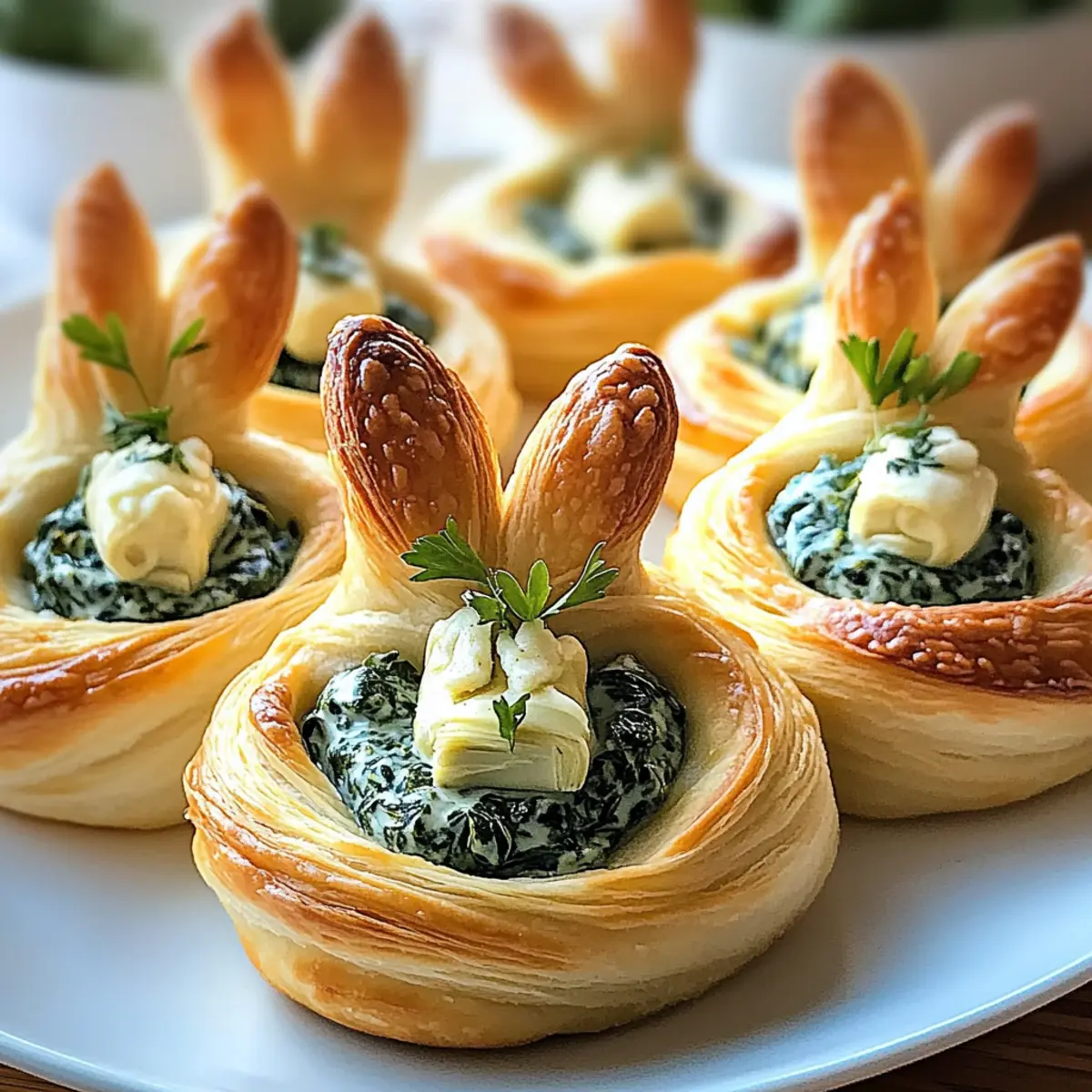 - Fill each baked crescent cup with the spinach-artichoke mixture and add bunny ears on top.