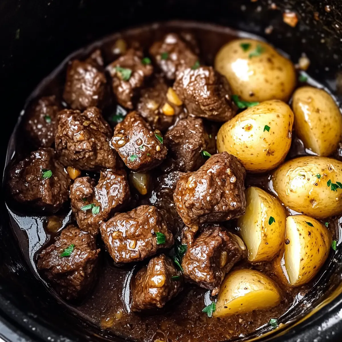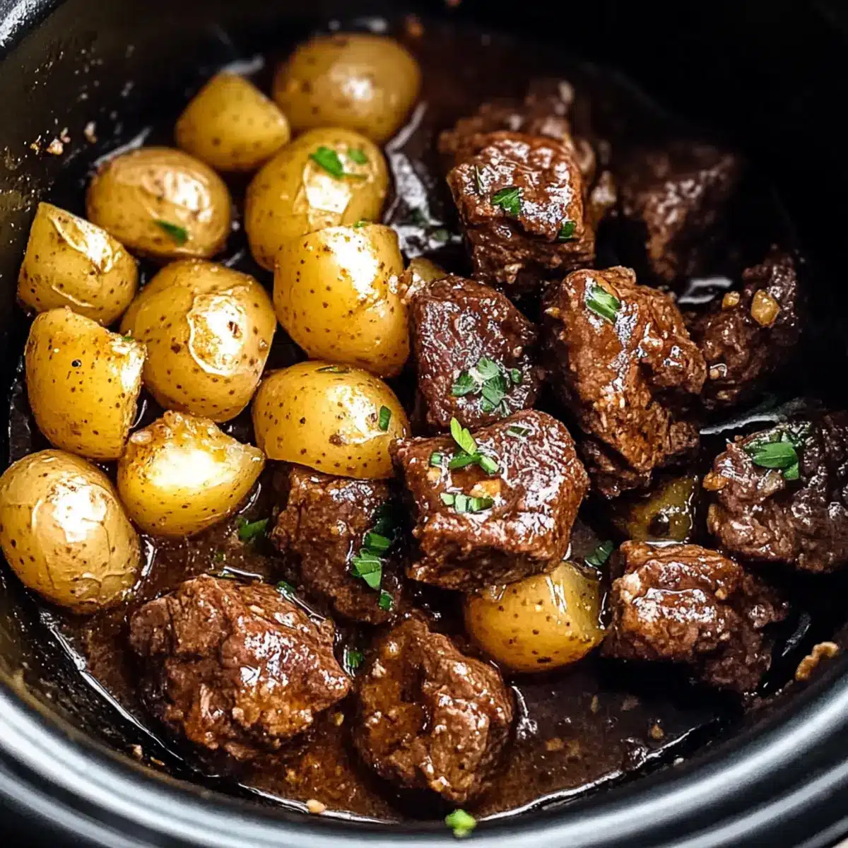 Carefully pour the sauce over the seared beef in the slow cooker. Then, toss the halved baby potatoes into the pot, ensuring they are evenly coated with the garlicky butter sauce. The creamy baby potatoes will absorb the flavors and complement the tender beef beautifully in these Garlic Butter Beef Bites.