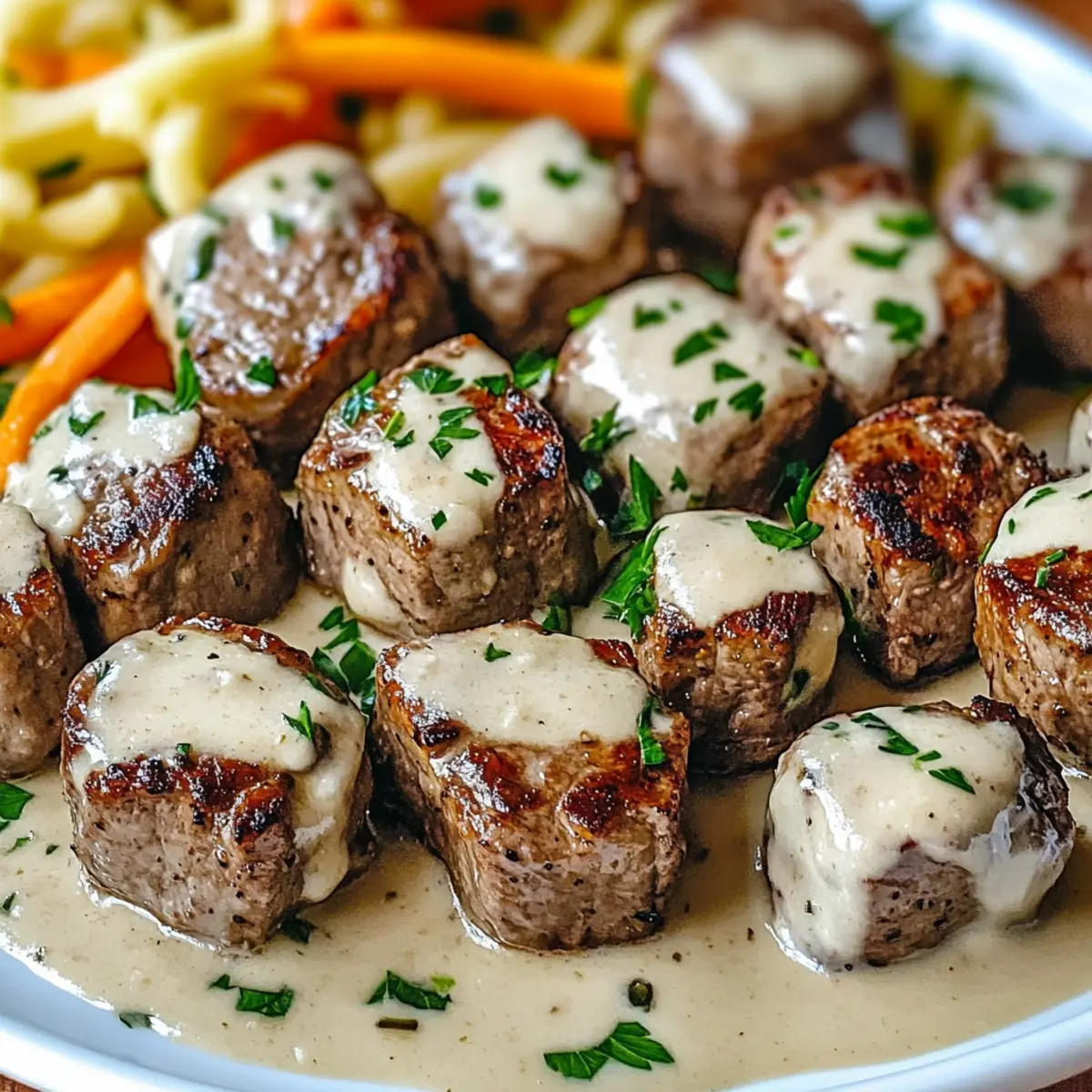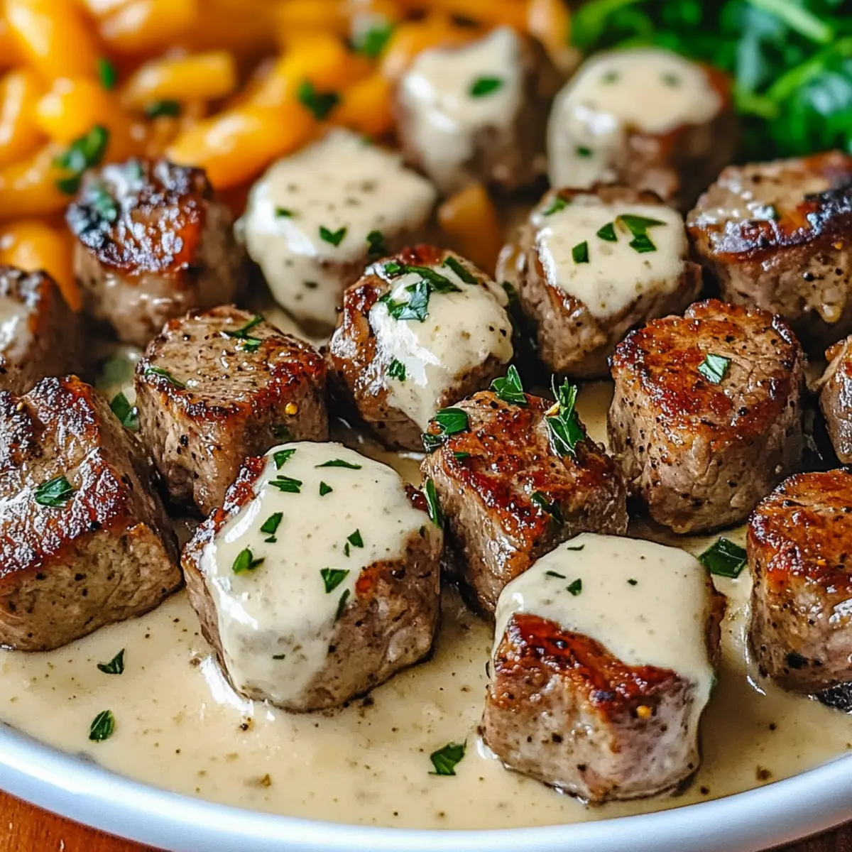 - Serve the creamy Parmesan sauce over the steak bites or on the side, garnished with chopped parsley.
