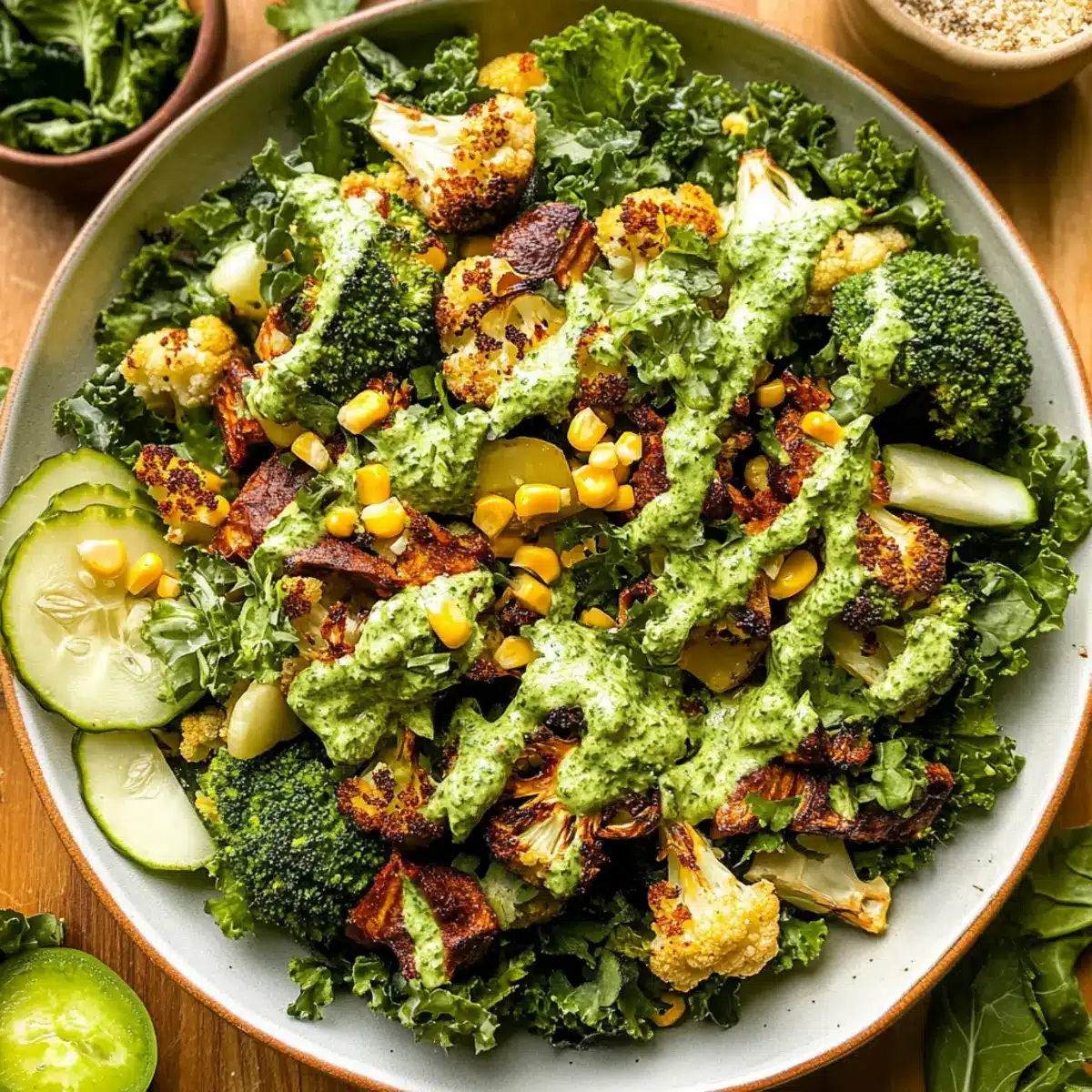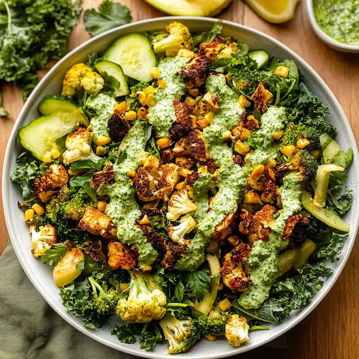 Start layering the salad by placing the massaged kale as the base in your large bowl. Top it generously with the roasted cauliflower, broccolini, sweet corn, diced jalapeños, and cucumber for a refreshing crunch. The medley of roasted and fresh ingredients will build a vibrant and nutrient-packed Green Goddess Salad.