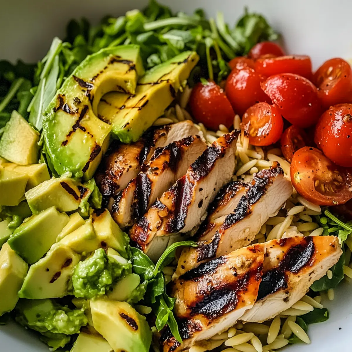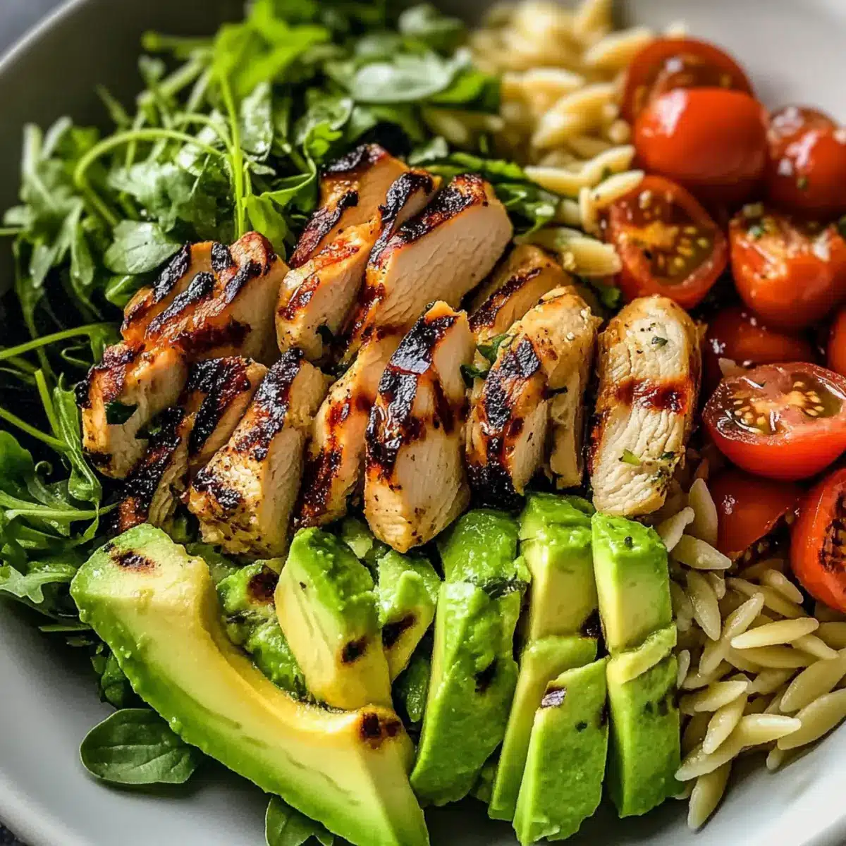 - Combine the Salad Ingredients: In a mixing bowl, add cooled orzo, sliced chicken, avocado, tomatoes, onion, feta, and herbs. Toss to mix well.