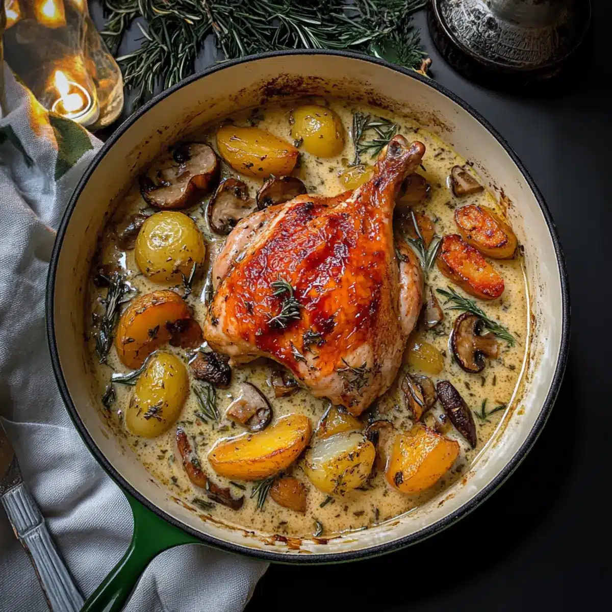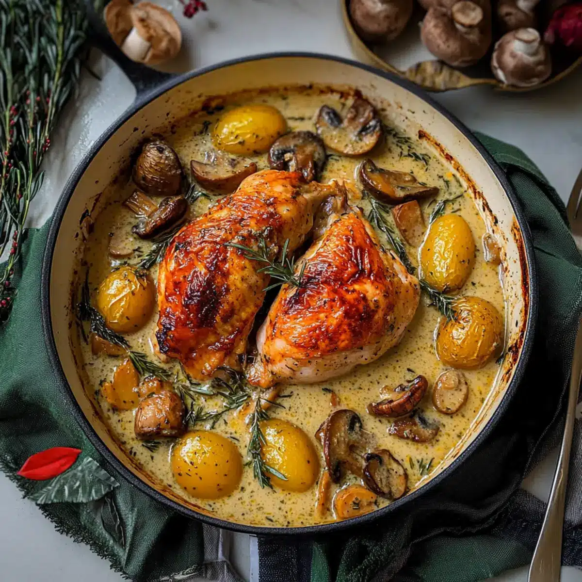 As I lifted the lid off my cast iron pot, the savory aroma of savory herbs and tender chicken washed over me like a warm hug. This Herb Roasted Chicken in Creamy White Wine Sauce isn’t just about nourishment; it’s the epitome of home-cooked love that transforms any gathering into a special occasion. With its juicy, herb-infused meat and rich, velvety sauce, this dish is not only a delightful comfort food but also impressively versatile—perfect for transforming simple weeknight dinners or festive holiday feasts into culinary memories. Imagine pairing it with buttery baby potatoes and some seasonal vegetables—the balance of flavors is guaranteed to warm your soul. Ready to elevate your dinner game? Let’s dive into the recipe!