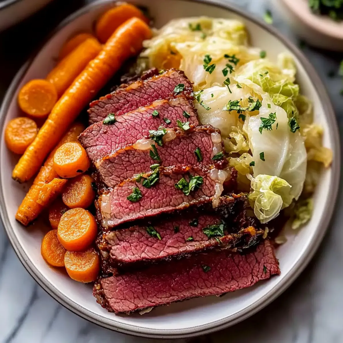 Plate your sliced homemade corned beef alongside the braised carrots and cabbage, garnishing with freshly chopped parsley and chives for a bright touch. Consider serving it with horseradish sauce for an extra kick. This hearty meal is perfect for a comforting family dinner or special gathering.