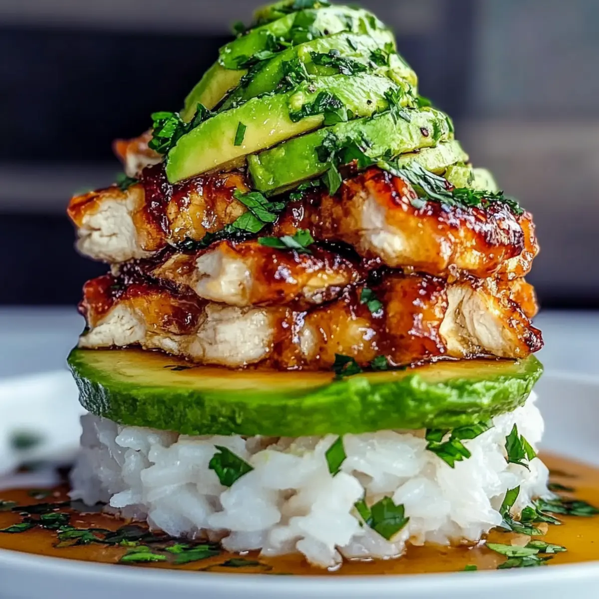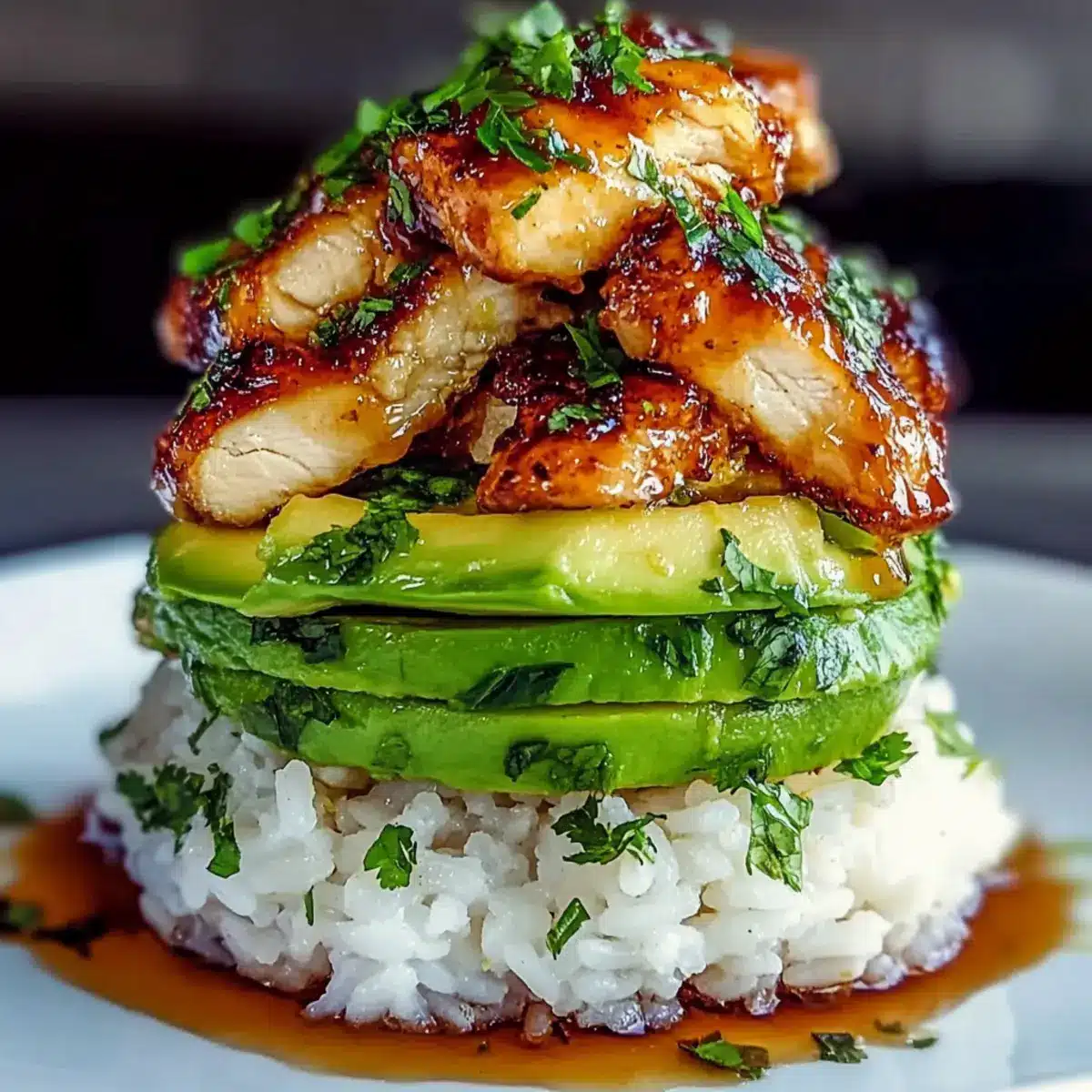 - Assemble the layers using a ring mold, starting with rice, followed by avocado slices, and topped with sliced chicken. Drizzle with remaining glaze.