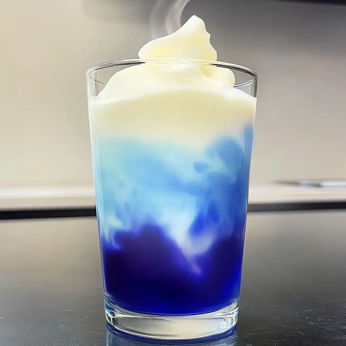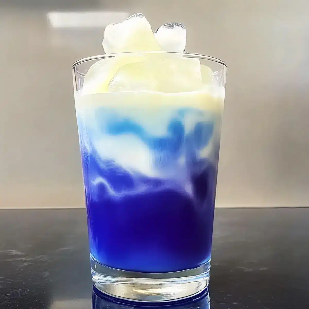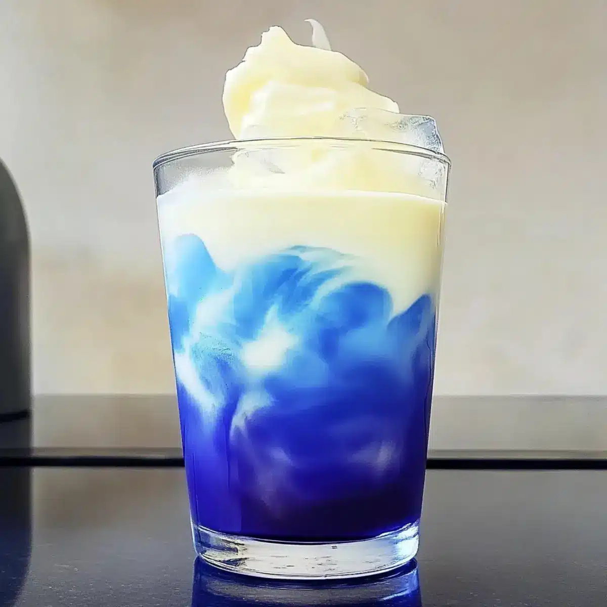 - Assemble the latte by pouring cooled blue tea into a glass filled with ice cubes, then layer cold foam on top.