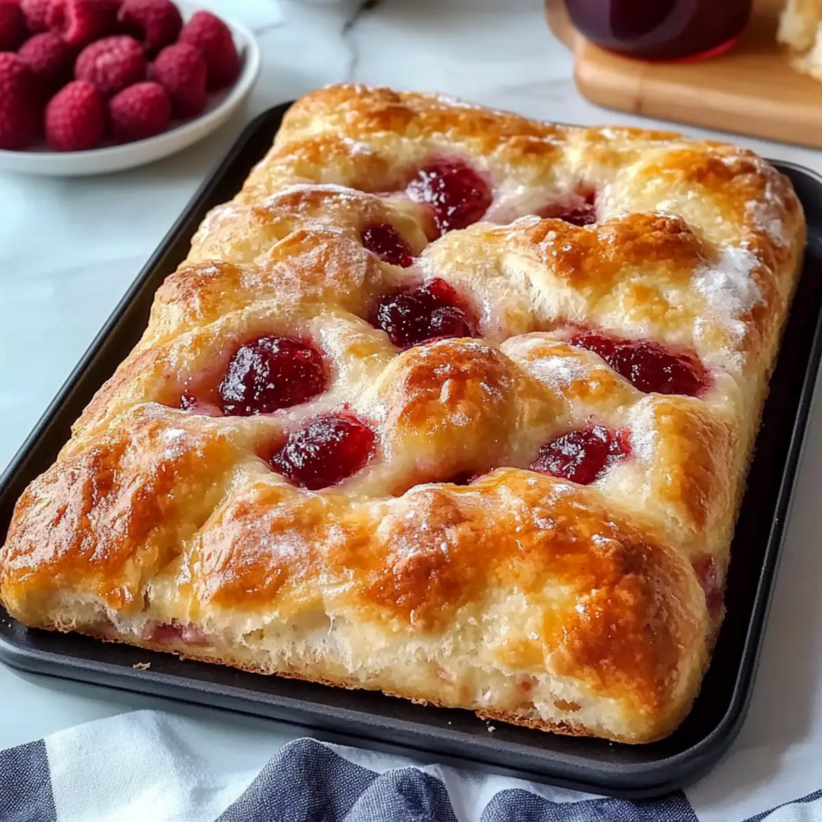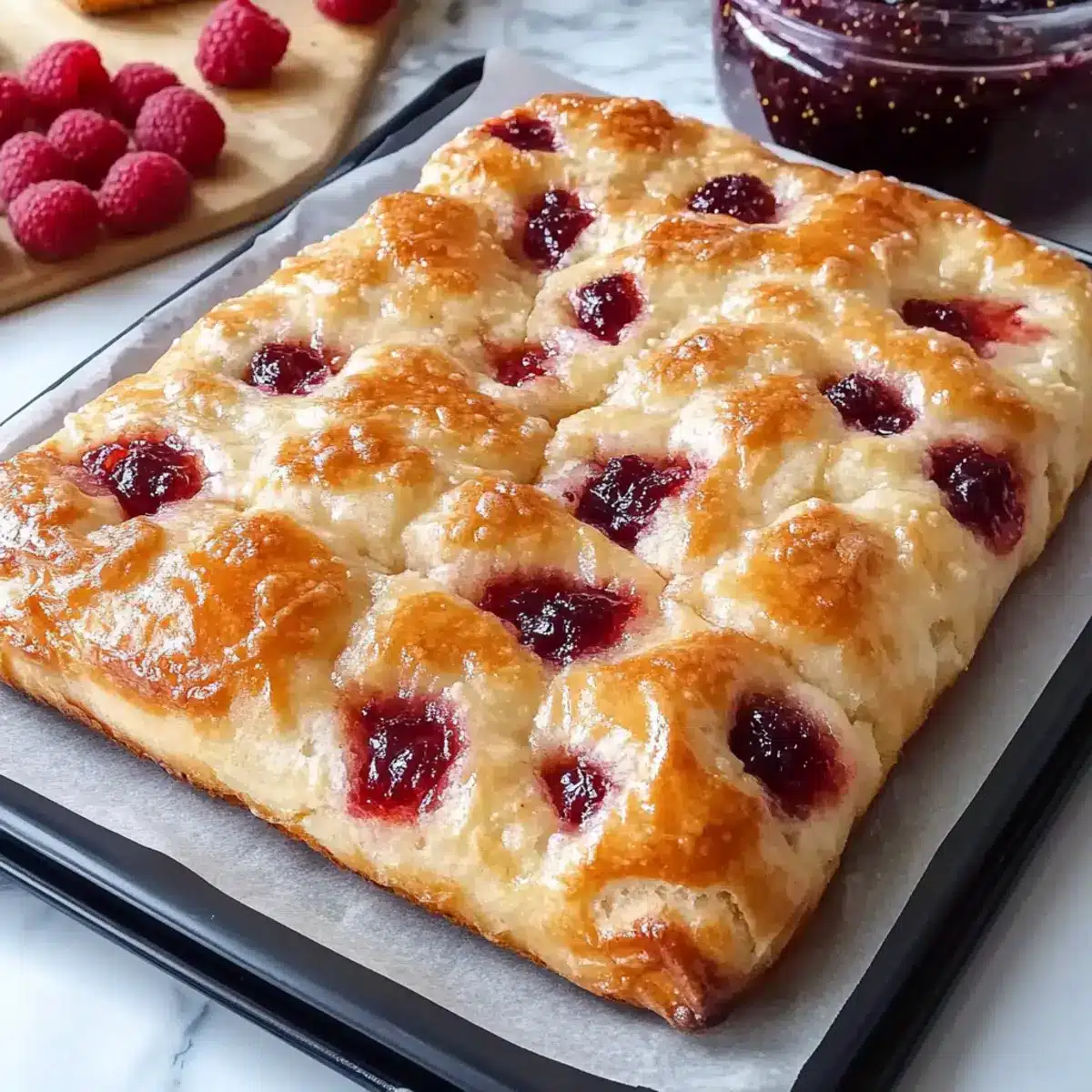 - Raspberry Preserves (1 jar) – Fills the focaccia with sweet, fruity goodness; feel free to substitute with any berry preserves.