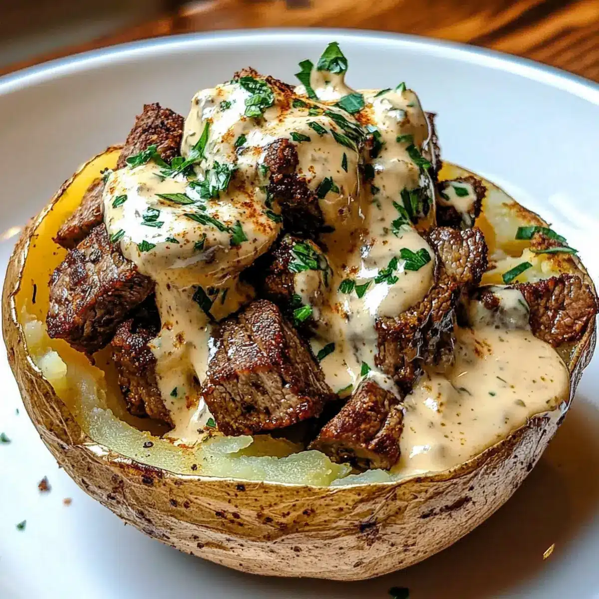 Herb Variation: Experiment with different herbs in the cream sauce, such as thyme or chives, to elevate the flavor of your loaded steak potato.