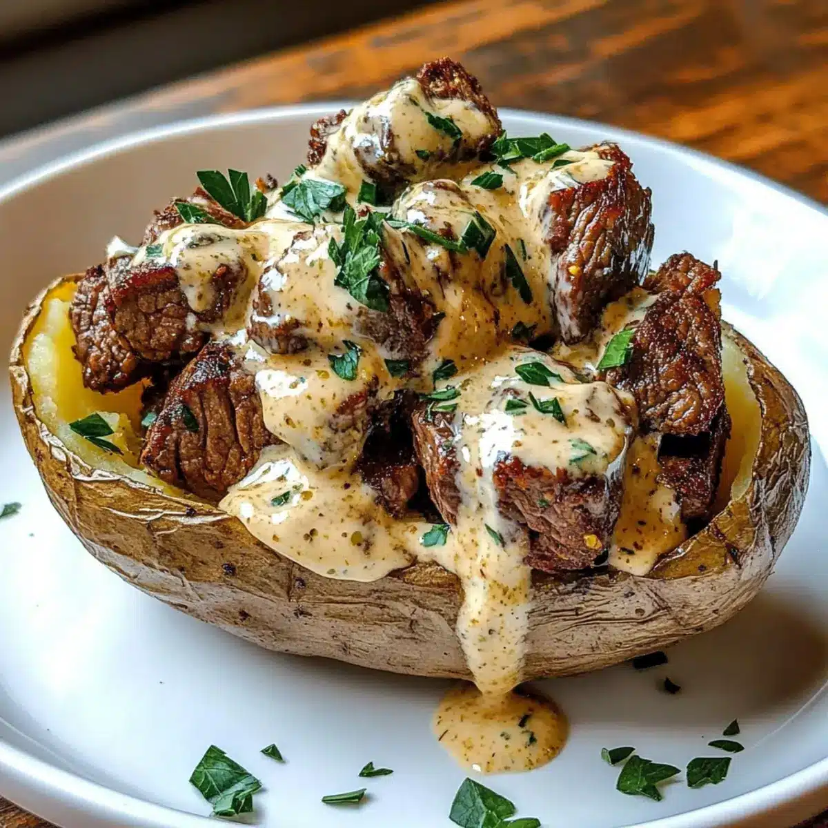 Ultimate Comfort: There’s nothing like sinking your teeth into a fluffy potato loaded with succulent steak and creamy sauce.