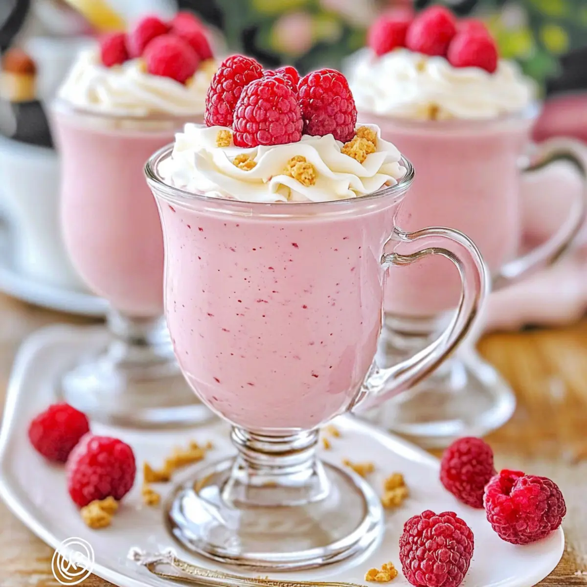 - Serve in mugs, optionally topping with whipped cream and fresh raspberries.