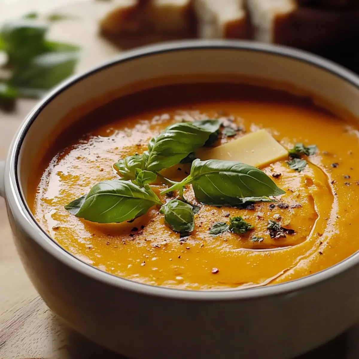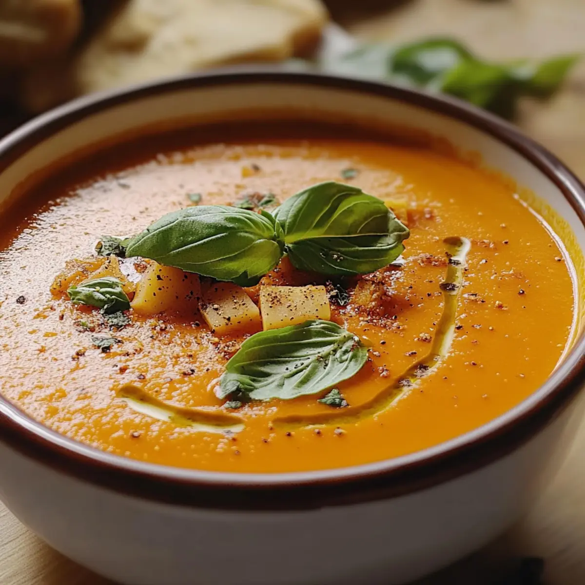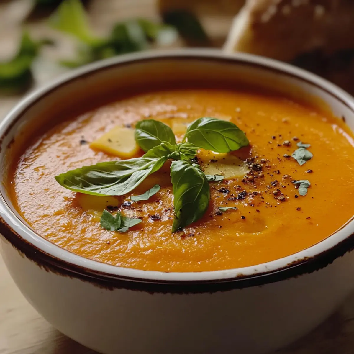 - Ladle the soup into bowls, garnishing with fresh basil and black pepper. Serve with croutons or bread.