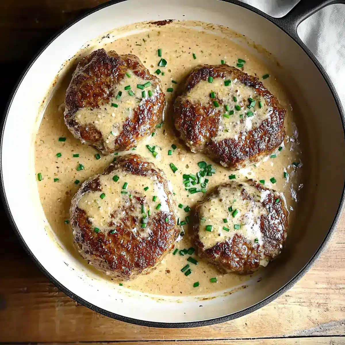 - Plate the Salisbury steaks and ladle the sauce over them, garnishing with chopped chives before serving.