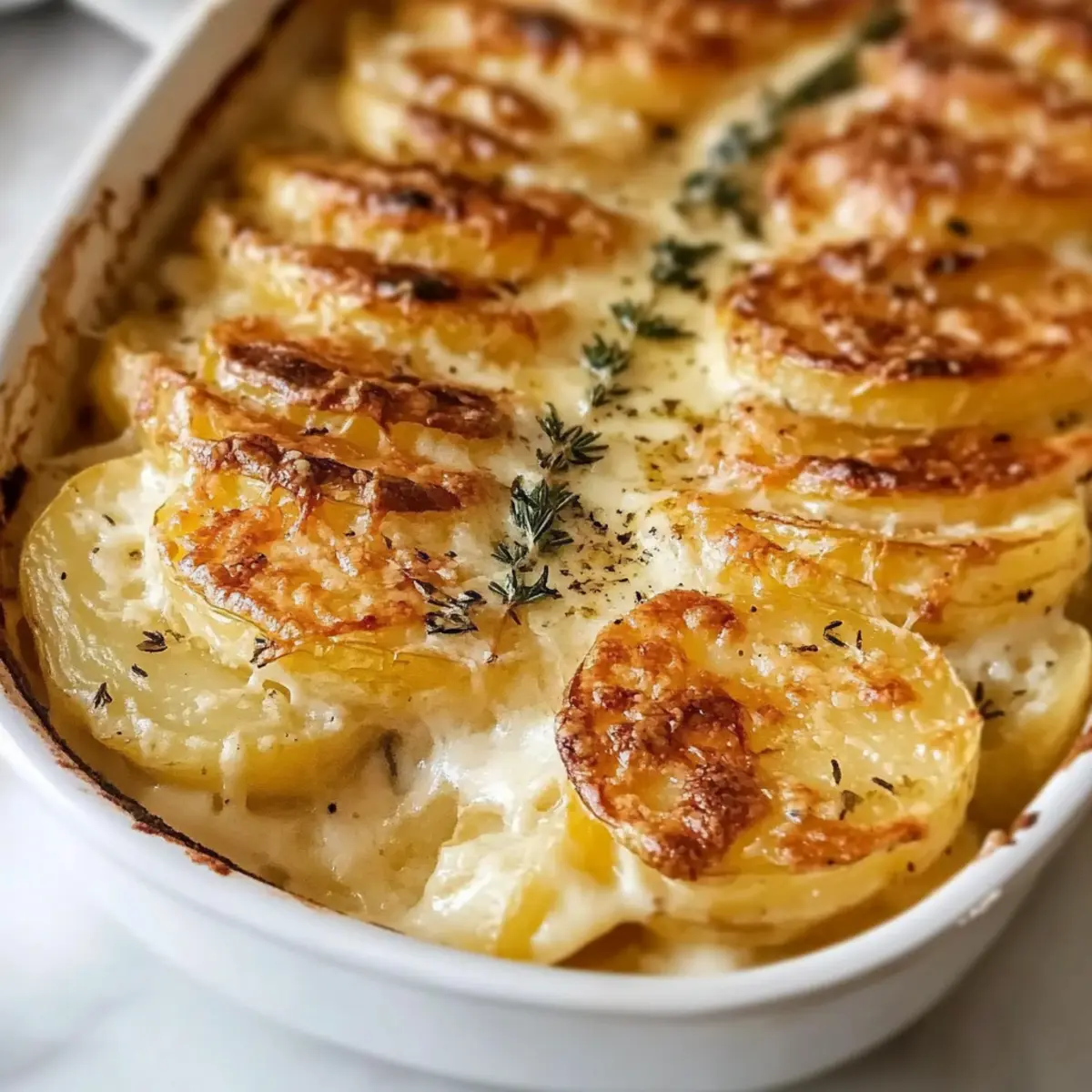 These Creamy Garlic-Thyme Scalloped Potatoes are perfect for busy home cooks looking to save time without sacrificing taste! You can prepare the entire dish up to 24 hours in advance by assembling it and then refrigerating it (this helps the flavors meld wonderfully). To maintain the creamy texture and avoid any rubberiness, cover the baking dish tightly with plastic wrap. When you’re ready to bake, simply remove the wrap and bake as directed, adding an extra 10-15 minutes to the cooking time since it will be cold from the fridge. With this make-ahead strategy, serving up a comforting side dish has never been so easy!
