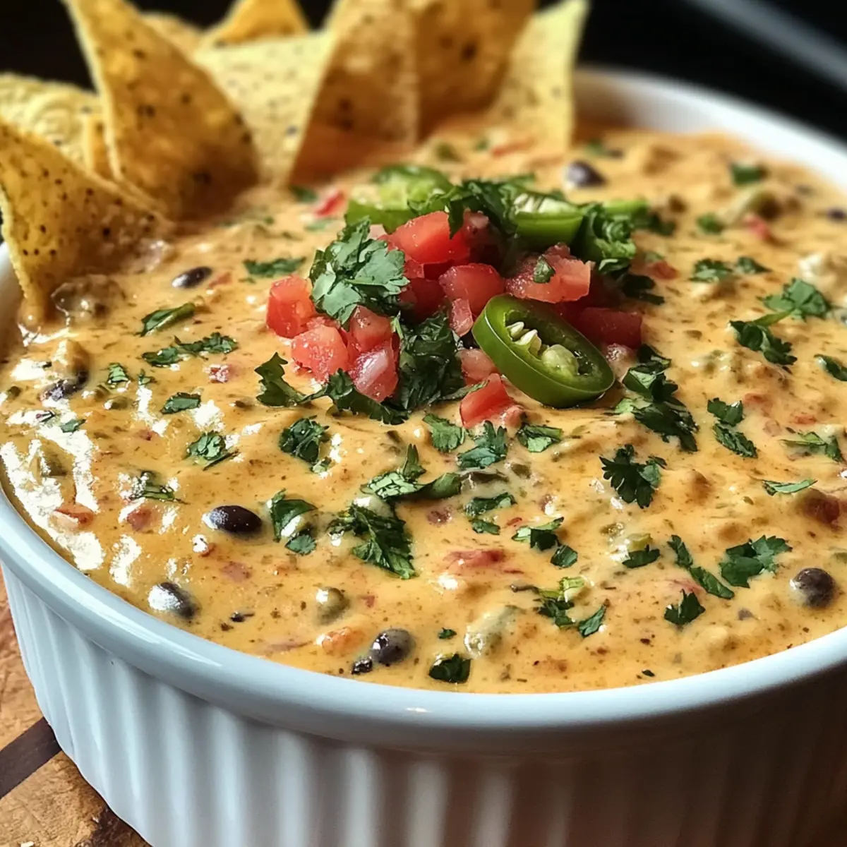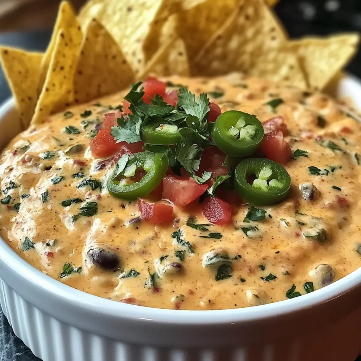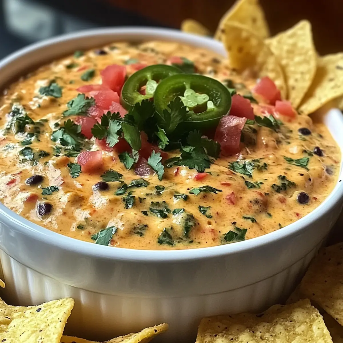 Mini Tacos: Serve the dip in mini taco shells topped with fresh cilantro and diced tomatoes for a bite-sized celebration of flavors.