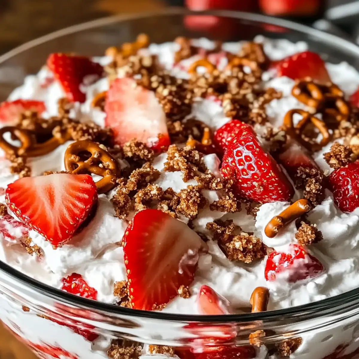 Transfer the assembled Strawberry Crackle Salad to a lovely serving bowl and top with the remaining pretzel crunch. This adds a final delightful texture that contrasts beautifully with the creaminess. Serve immediately for the best experience, ensuring everyone enjoys the full flavor combination together.