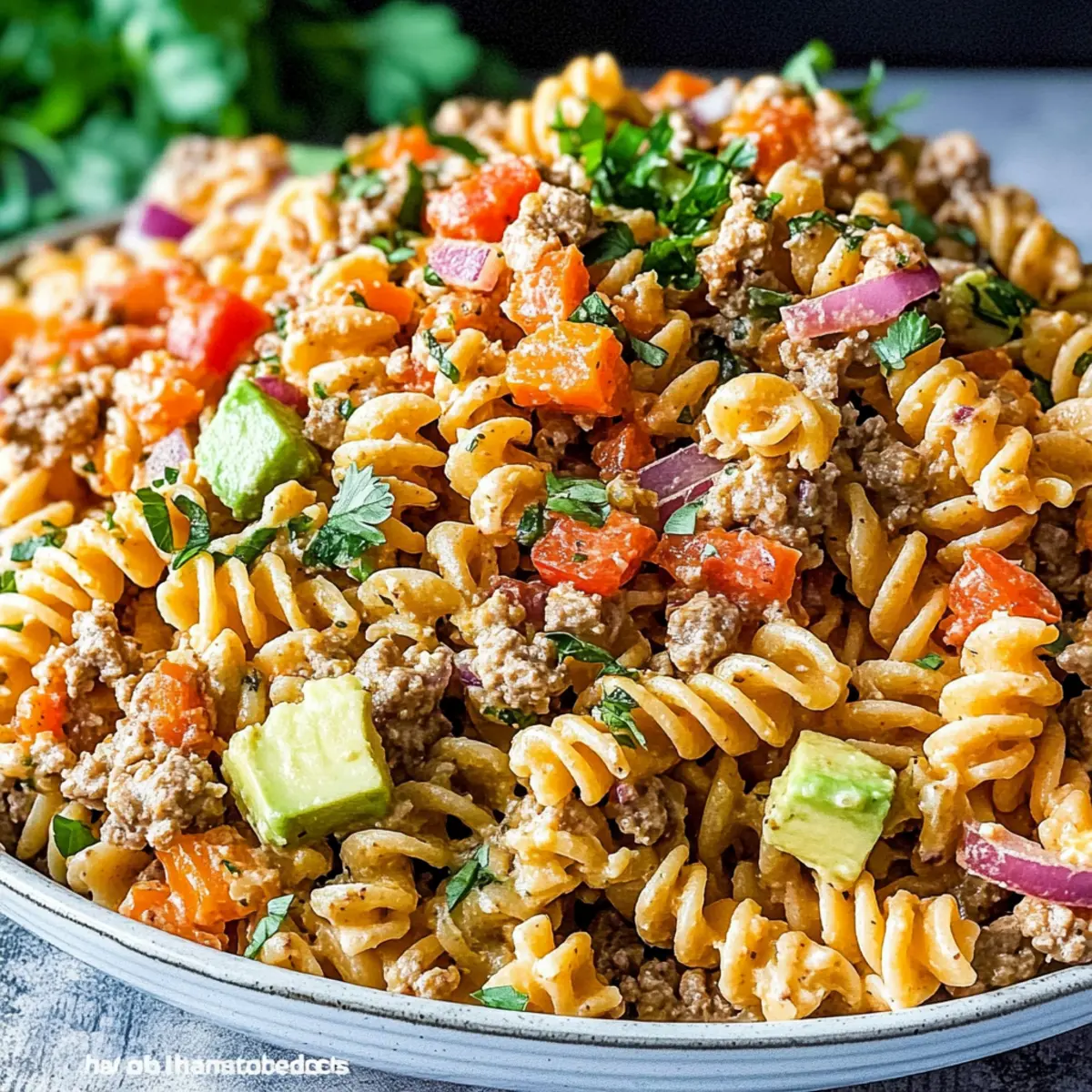 - In a large mixing bowl, combine cooled pasta, seasoned beef, and creamy dressing. Add chopped red onion, diced red pepper, halved grape tomatoes, and cilantro. Toss gently.