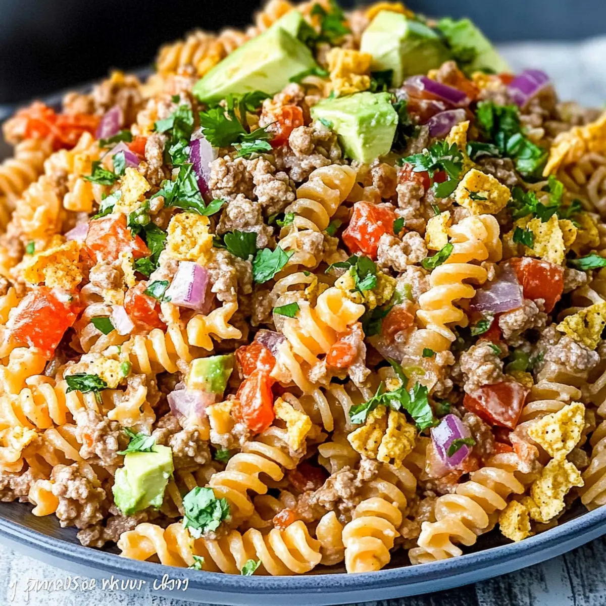 Before serving, check the salad’s dressing consistency and adjust by adding more milk if necessary for a creamier texture. Gently fold in shredded sharp cheddar cheese, Monterey Jack cheese, and crushed Doritos for that signature crunch. Top with diced avocados and garnish with remaining Doritos and fresh cilantro, making your taco pasta salad even more enticing.