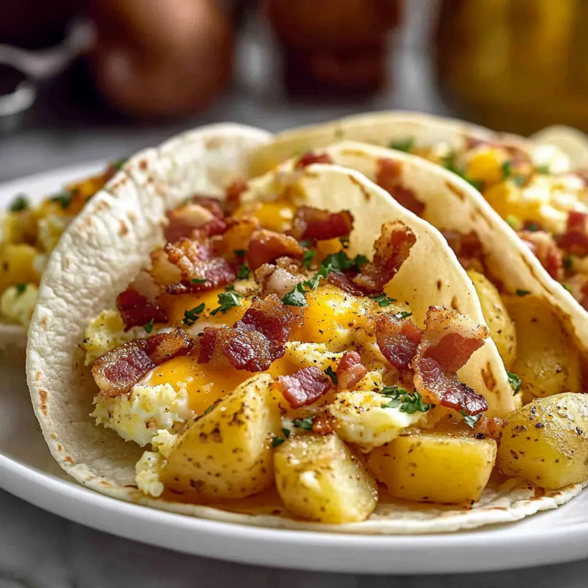 Take your soft corn tortillas and arrange them in a greased baking dish, slightly overlapping if necessary. Begin filling each tortilla with a generous scoop of the seasoned potatoes, followed by fluffy scrambled eggs cooked until just set. Finish each taco with the delicious chopped bacon for a burst of flavor.