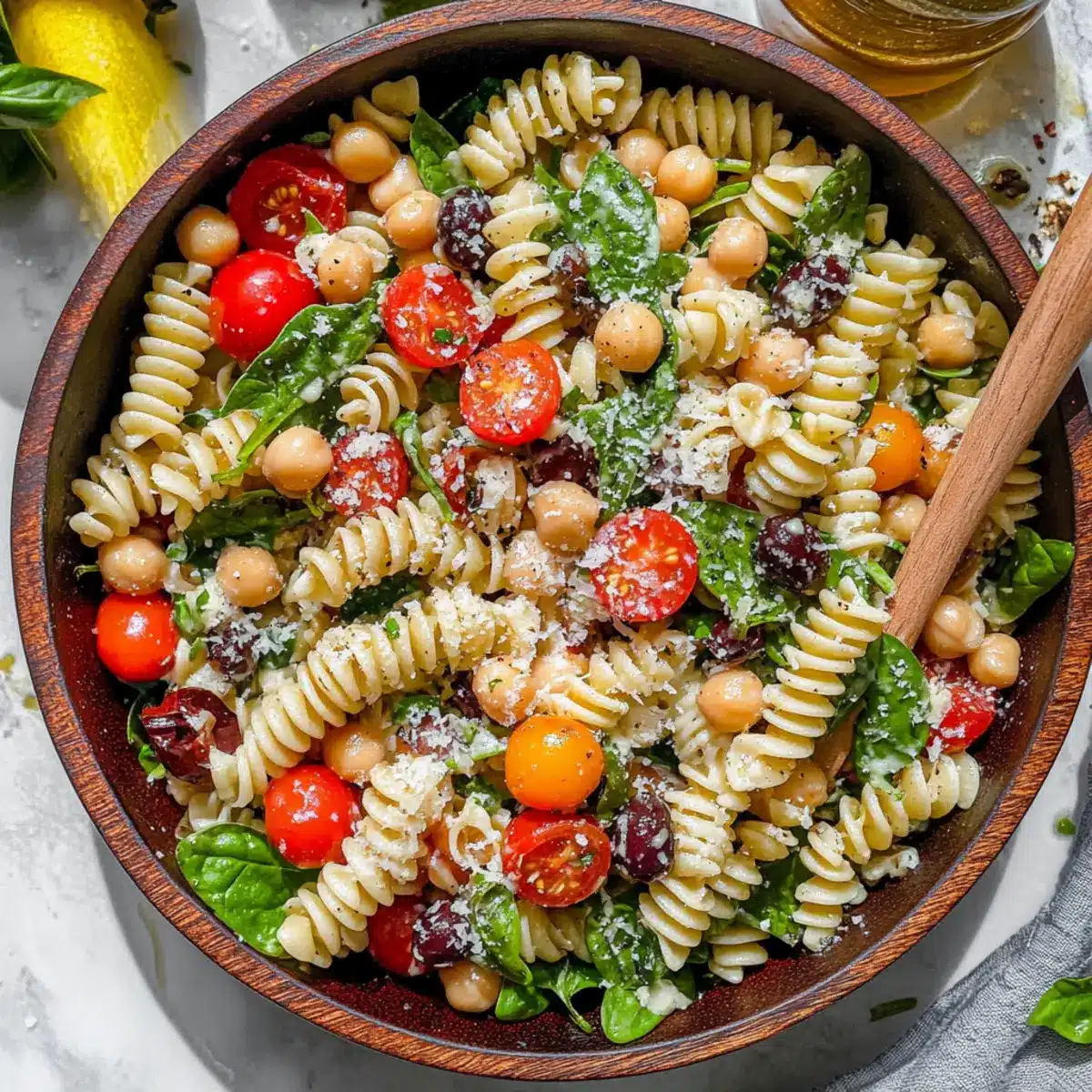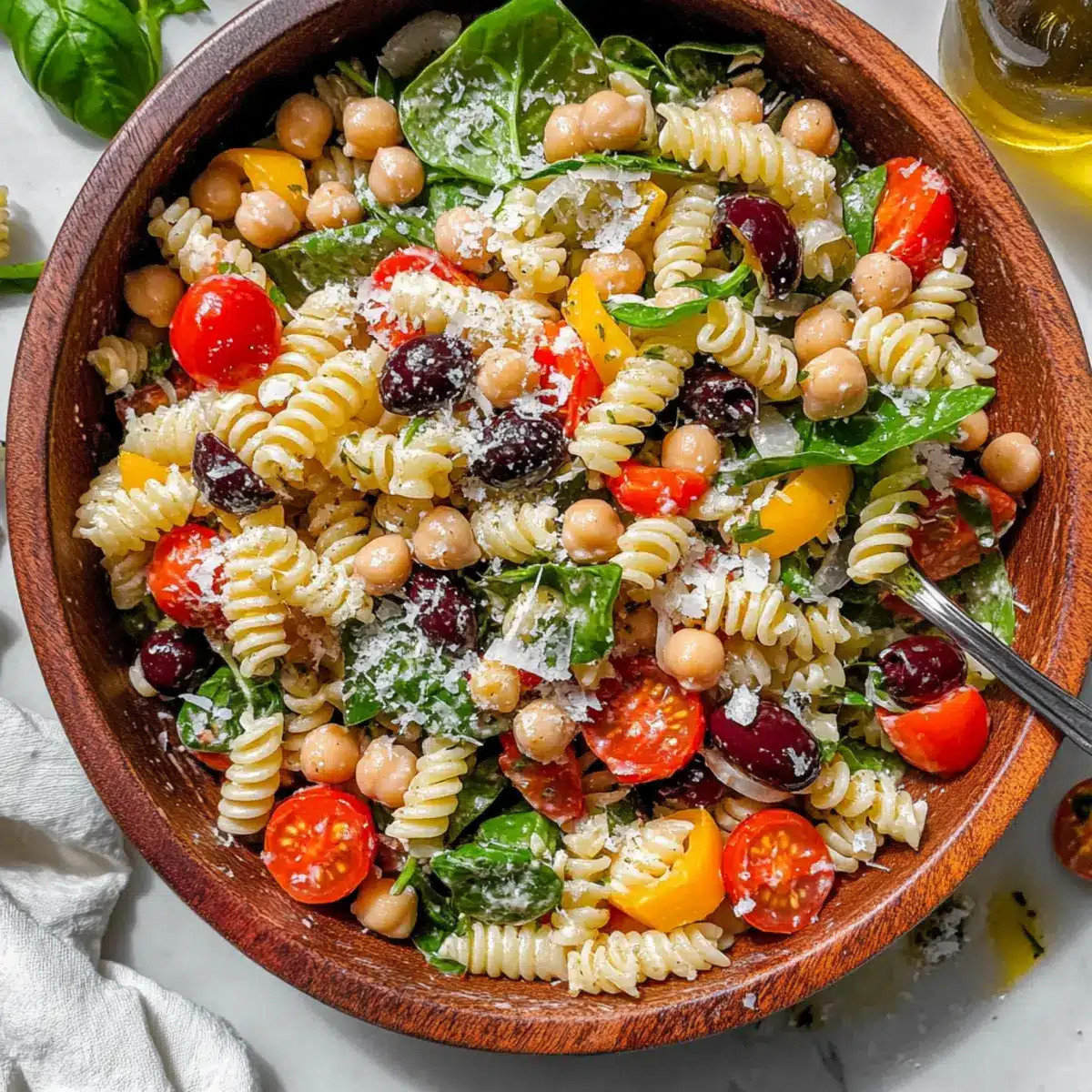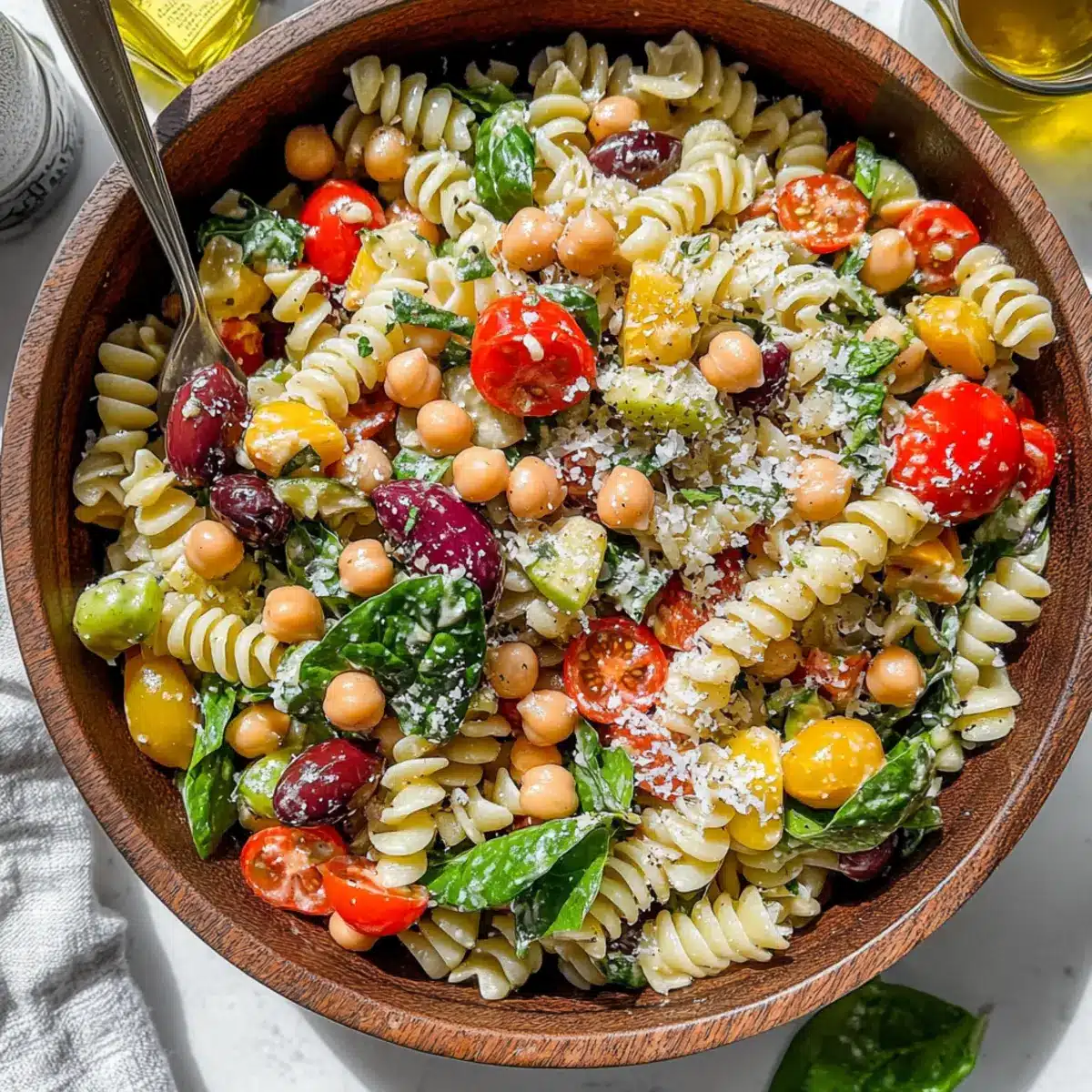 In a large mixing bowl, combine the cooled fusilli pasta with 1 can of rinsed chickpeas, 1 cup of halved cherry tomatoes, 1 cup of diced mini sweet peppers, and 2 cups of fresh baby spinach. Add ½ cup of sliced Kalamata olives and ½ cup of grated Parmesan cheese. For an extra creamy touch, include ½ cup of diced provolone or mozzarella cheese, mixing well to incorporate all the vibrant ingredients.